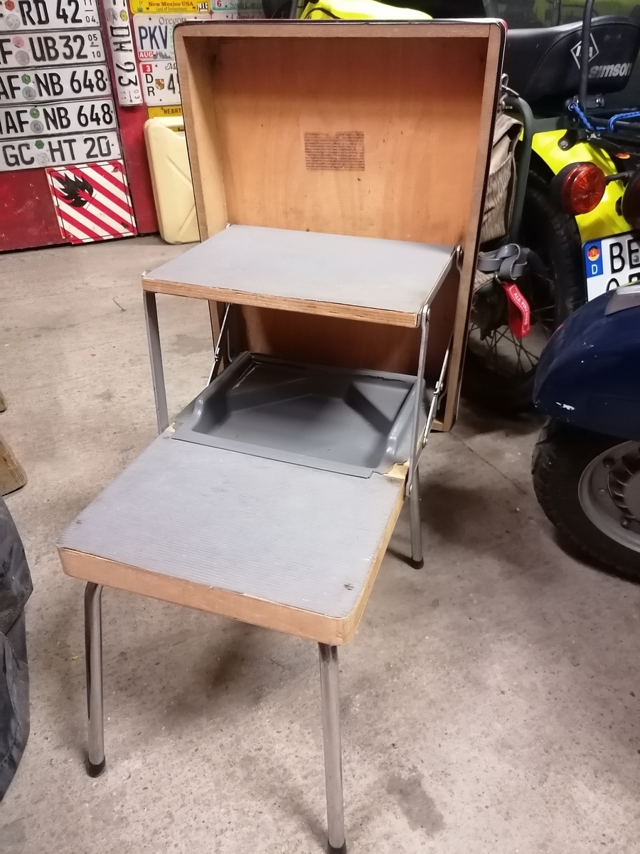 Inklusive kleiner Tritt. Schrauben müssen alle nachgezogen werden soweit ich das gesehen habe. Einmal stramm sauber machen und feddich ist der Breitarschsitz für die Werkstatt