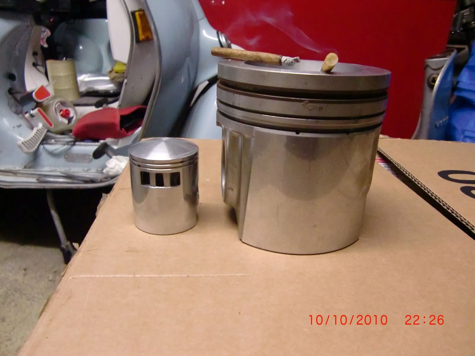 (zum Größenvergleich habe ich mal nen Kolbem vom 133er danebengestellt) Der andere, größere Kolben von dem Ich es verpeilt habe Fotos zu machen kommt in meine T5!