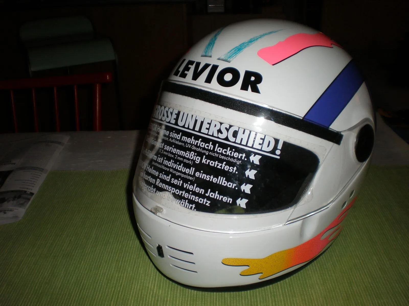 grade von meinem freund einen niegelnagelneuen levior-helm im schutzsack bekommen, stammt aus dem requisitenfundus und muß so aus den 80ern sein wenn man sich die aufkleber angeguckt :D