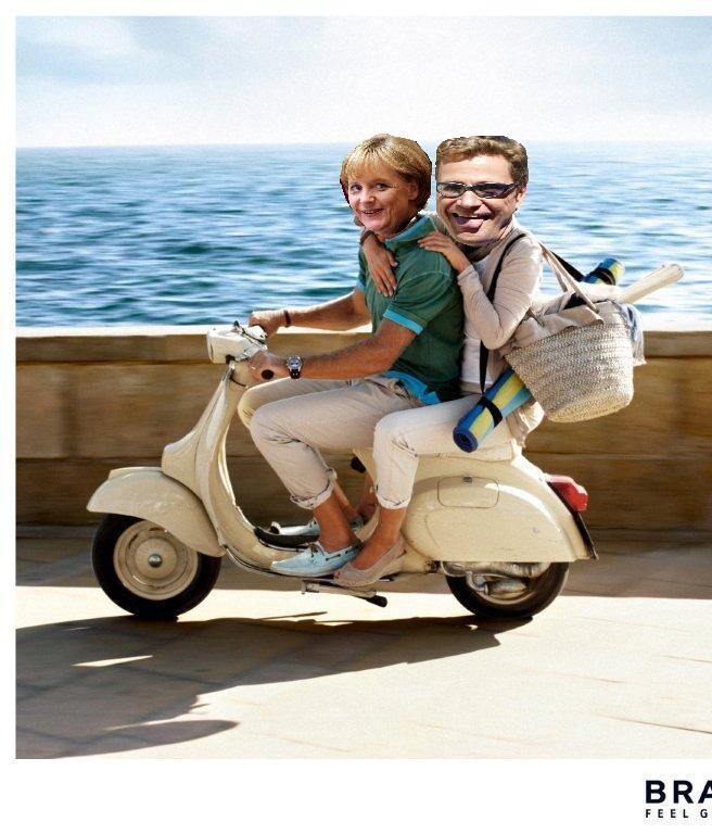 ich stell mir schon die merkel und Westerwelle auf der vespa for wie merkel die kuplung springen lässt und der westerwelle sagt das ist wie früher mit Detlef