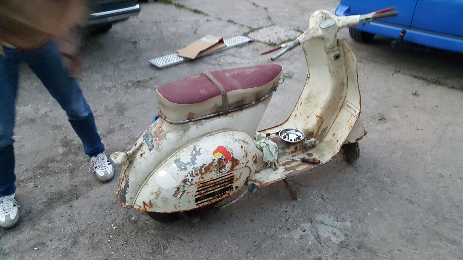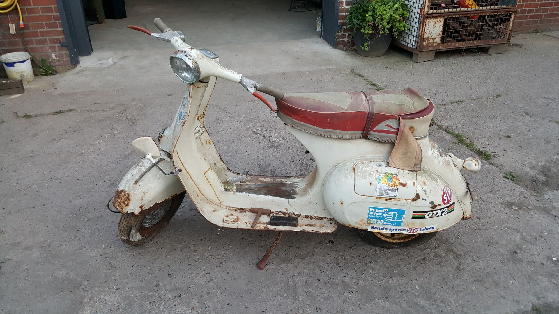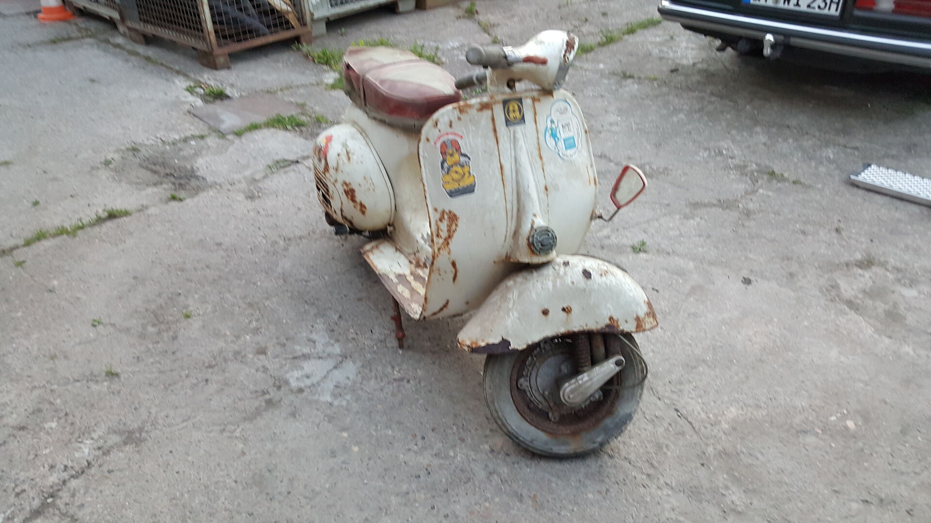 Vespa T4, Bj1960, Original Papier und Anmeldebescheinigung von 1979. Schon knusprig aber nicht durch zumindest der Rahmen nicht. Seitenbacke ist unten auf. Sitzbank sehr guter Zustand. Motor fest, Trommel vorne auch fest. Original Hupe uns Rücklicht vorhanden. Das wir ein schönes Projekt