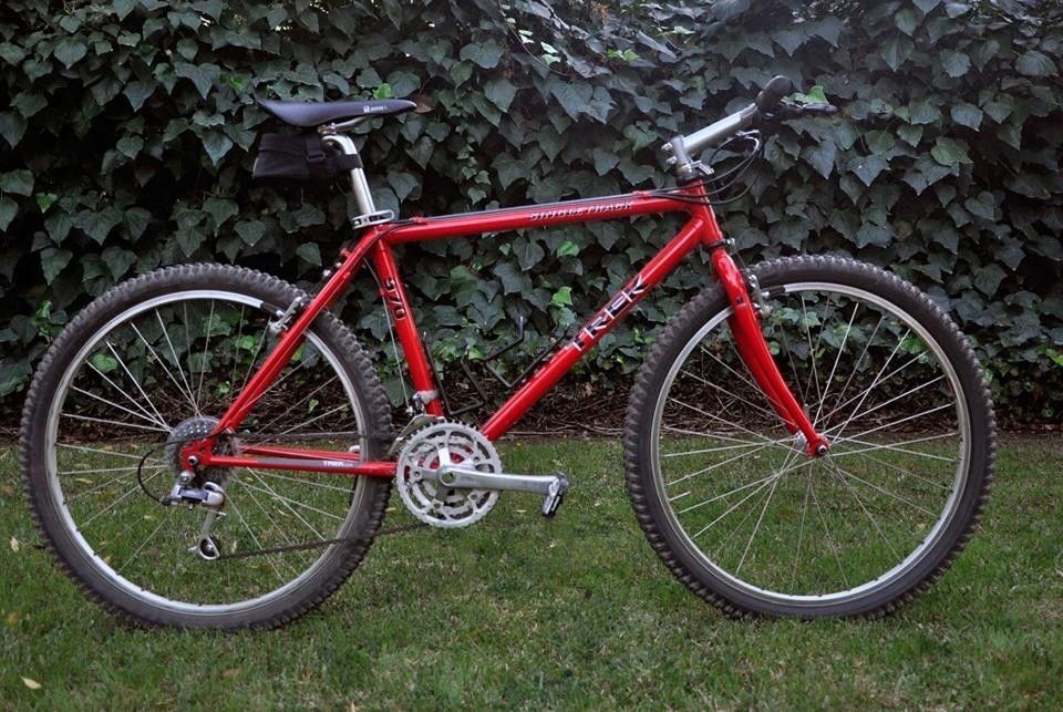 , dass ich mir damals zum 18. Geburtstag (1990) von sauer verdienter Kohle in 6 Wochen Sommerferien und Geburtstagskohle für 1.999 DM gekauft hatte. Ist ein TREK Singe Track 970 aus 1992/1993. Mein früheres 90er Modell hatte lediglich schwarzen Vorbau und Sattelstütze und die Schriftzeichen waren weiß und nicht schwarz wie beim 93er Modell.