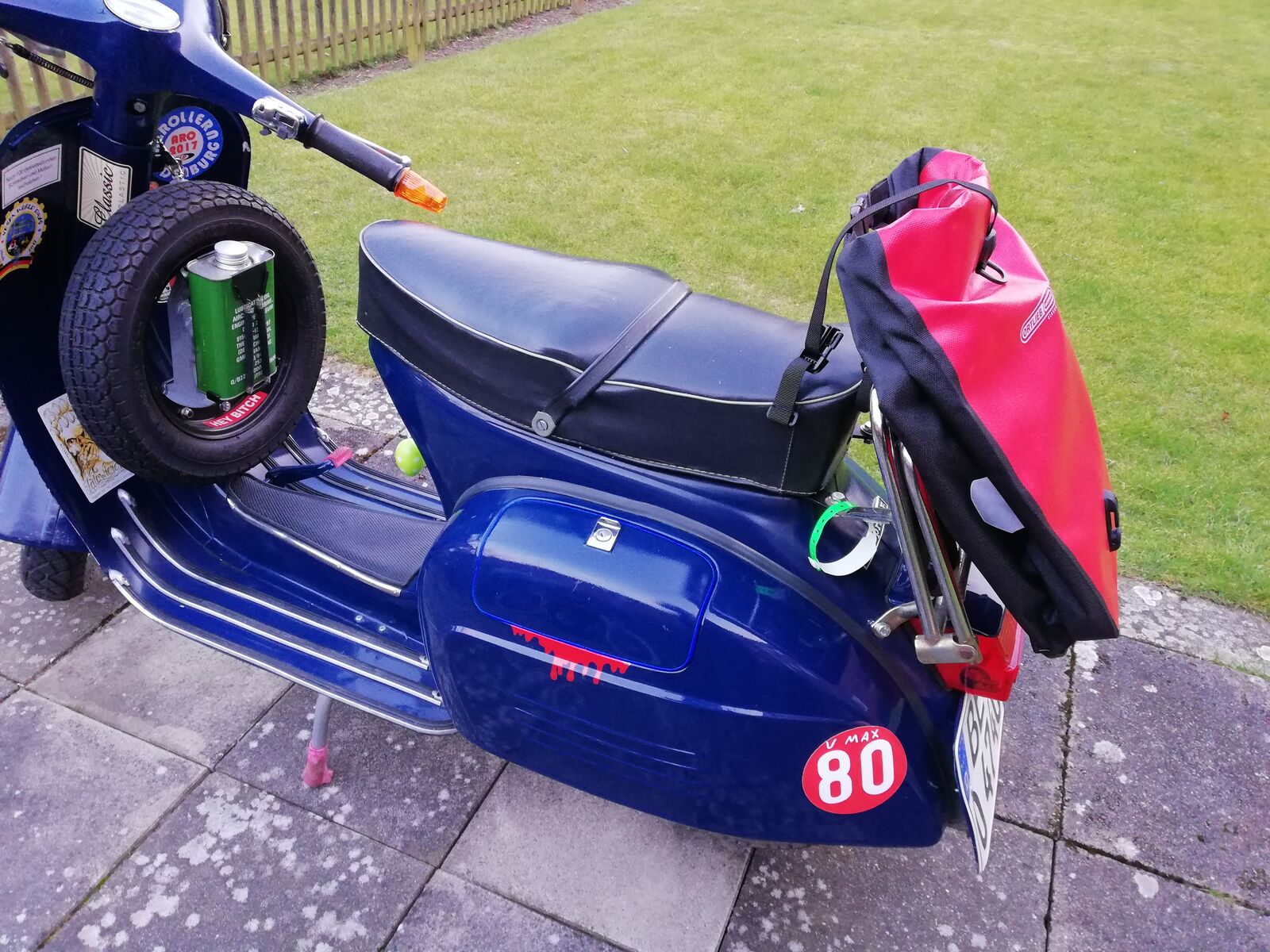 Kumpel hatte noch ne Ortlieb Back Roller Fahrradtasche (neu) über. Hatte sie eigentlich für mein Fahrrad gekauft. Passt aber auch super an den Gepäckträger von den Vespas ![]()