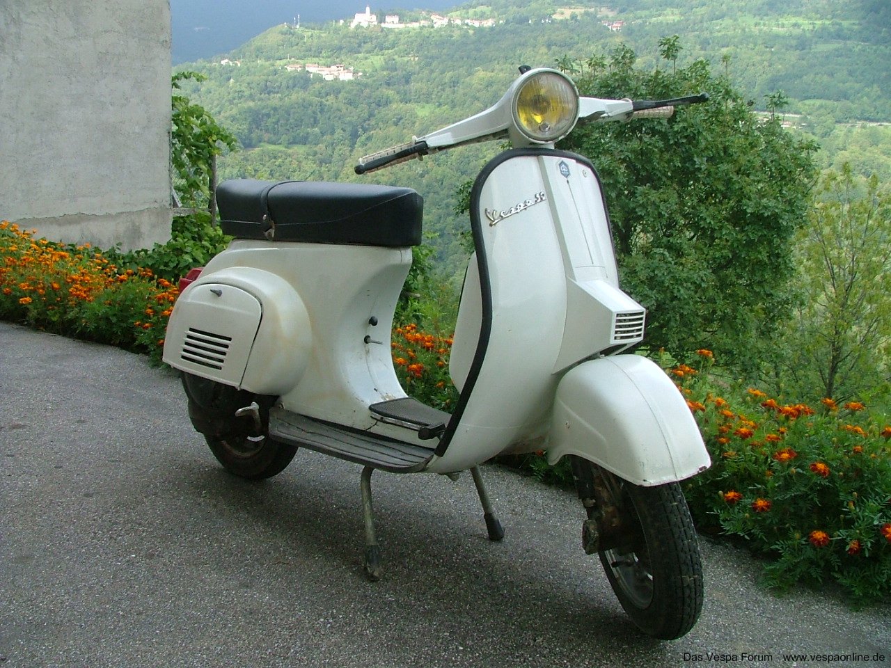 Nun habe ich auf vespafarben.de nach dem richtigen Farbton geschaut, finde aber für die PX80 drei verschiedene Weißtöne. Klicke ich dort auf den angegebenen Link sieht es auf dem folgenden Foto nach Biancospino 715 aus (was ich aber nirgends finde). Wenn ich die KI befrage, würde die sich eher für Weiß 693 entscheiden. Auch hier gibt es Beispielfotos, wo das passen könnte. Und dann soll es noch RAL 9016 und RAL 9010 geben, was gut an die originale hinkommen soll.