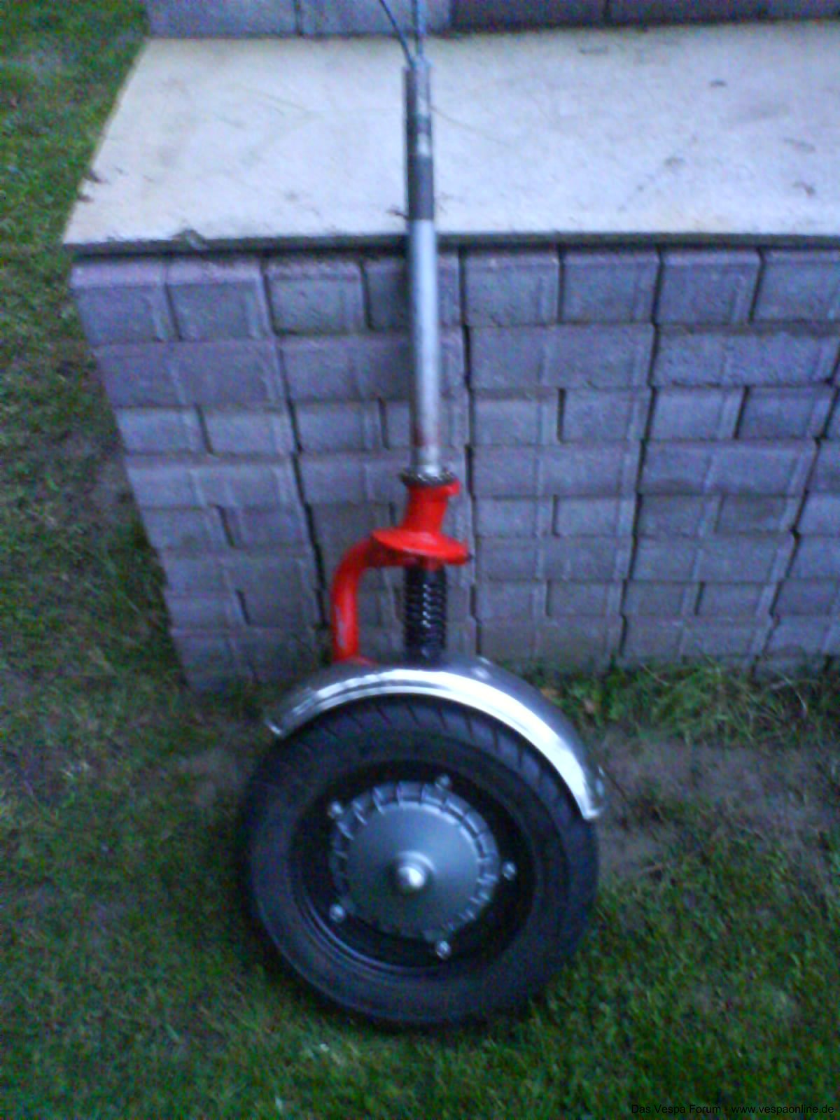 Heute habe ich die Gabel zusammen gesetzt und noch einen Reifen samt Schlauch gekauft. Das ganze habe ich mit einem verchromten Garelli-Schutzblech versehen.