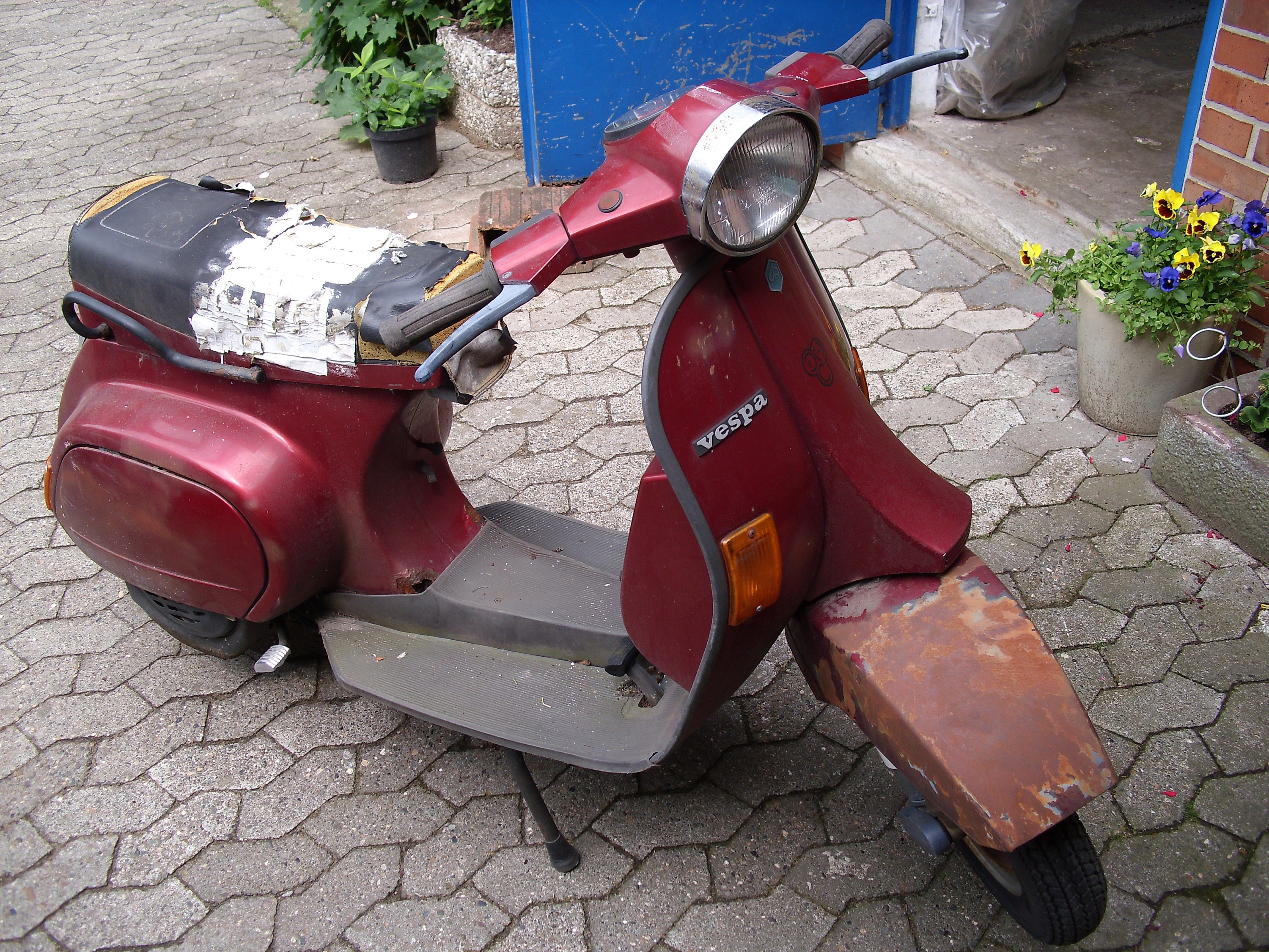 So kam sie ( Und die Vespa Leidenschaft) im Sommer 2008 bei mir an. Stand 3 Jahre bei Wind & Wetter in Hannover an der Bödekerstraße. Der Motor hatte einen Lagerschaden und einen Polini 50 verbaut. Der Rahmen war bei den Trittbrettern komplett durchgerostet. Der Rahmen wurde gegen einen neuen getauscht. Die Farbe blieb bei Weinrot. Im Mai 2013 ging es endlich los und die Vespa wurde komplett erneuert. Im März 2014 habe ich dann noch den Motor gespalten und den Kurbelwellenlagerschaden beseitigt. Der Polini ist immernoch verbaut und kommt seinen Diensten sehr gut nach.
