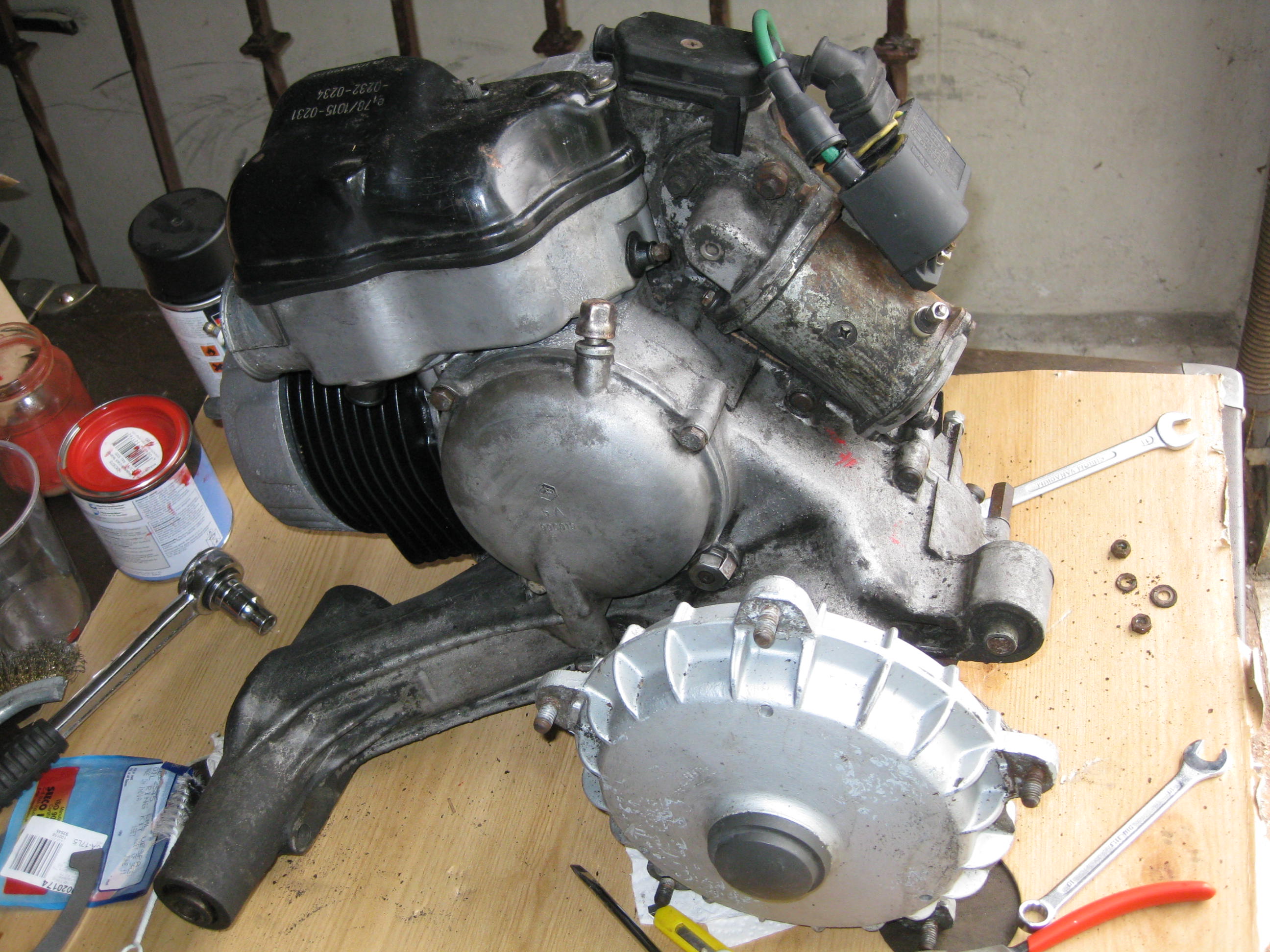 Ich habe erst später erfahren, dass die Vespa nach dem Umbau ca. 16 Monate gestanden hat. Jedenfalls ist der Motor undicht. Es wurde jetzt schon mal nachgearbeitet, angeblich war die Getrieböl Ablasschraube locker. Gestern habe ich sie abgeholt, der Motor war äußerlich komplett sauber. Heute bin ich ca. 30km gefahren , danach sah der Motor so aus (Videos im Link).