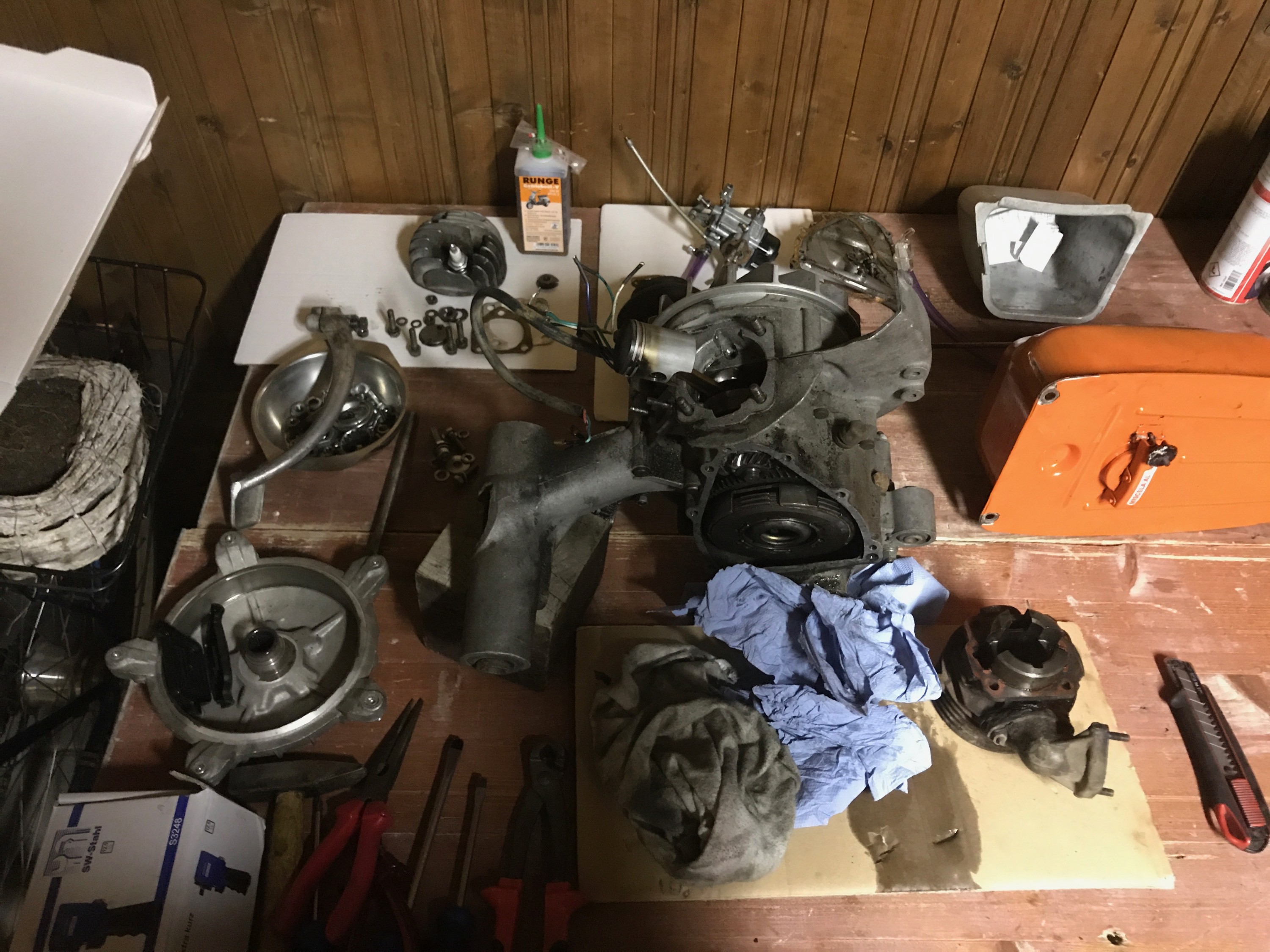 Es ist ein VNL3M Motor, Kurbelwellenlager der großen Blockseite mit zwei Seegeringen beidseitig gesichert, Simmering Vollgummi mit Rille im Block - sonst alles PX entsprechend. 200er Lusso Vorgelege und Hauptwelle. Lager fielen mit Erhitzen und Kältespray so in den Sitz, würde gerne weiter so behutsam zusammen bauen wollen.