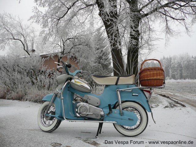 Naja, is nur noch kleiner, hat ein durchgehendes Beinschild-Trittbrett, viel kleinere Räder (12Zoll), Viergangfusschaltung, mehr Chrom..