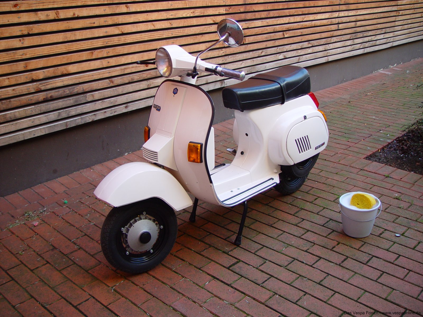 Nun habe ich auf vespafarben.de nach dem richtigen Farbton geschaut, finde aber für die PX80 drei verschiedene Weißtöne. Klicke ich dort auf den angegebenen Link sieht es auf dem folgenden Foto nach Biancospino 715 aus (was ich aber nirgends finde). Wenn ich die KI befrage, würde die sich eher für Weiß 693 entscheiden. Auch hier gibt es Beispielfotos, wo das passen könnte. Und dann soll es noch RAL 9016 und RAL 9010 geben, was gut an die originale hinkommen soll.