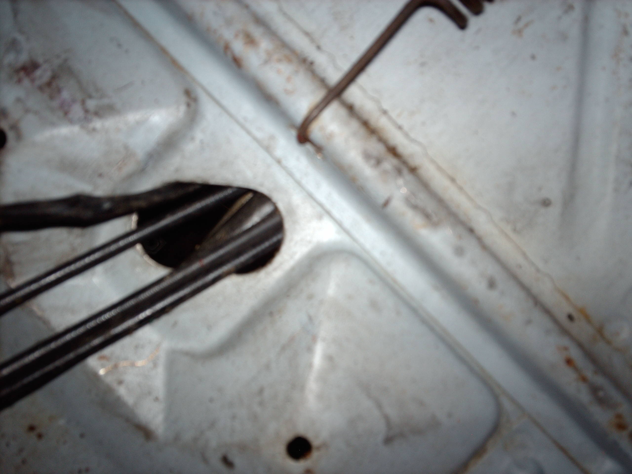 Die vordere Schraube dreht ins Leere. Die am Blech von innen befestigte Mutter ist reingefallen.