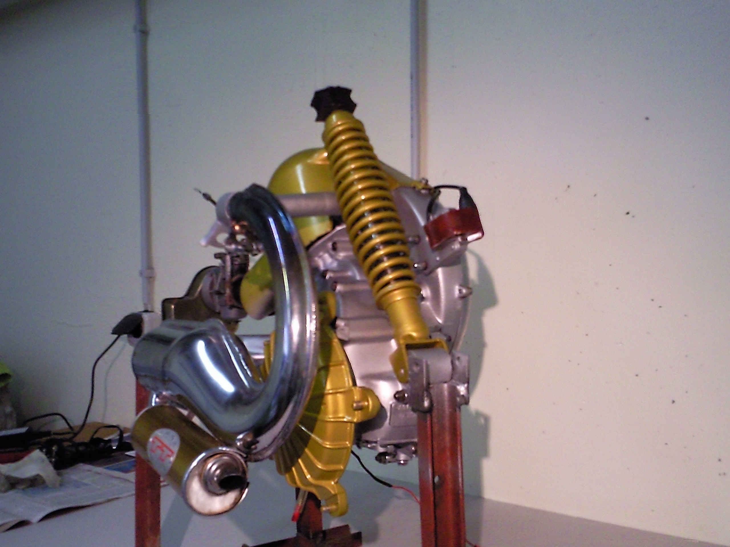 Es tropft hinten rechts, der Motor ist aber auch oben feucht, das komplette Hinterrad ist rechts voller Öl. Das Öl auf dem Auspuff ist vermutich vom Hinterrad dorthin geschleudert worden. Meine Vermutung ist, dass entweder dr Motor beim Zusammenbauen nicht gut abgedichtet wurde, oder dass die Undichtigkeit durch die lange Standzeit nach dem Zusammenbauen hervorgerufen wurde. Meiner Meinung nach müsste der Motor neu abgedichtet werden,