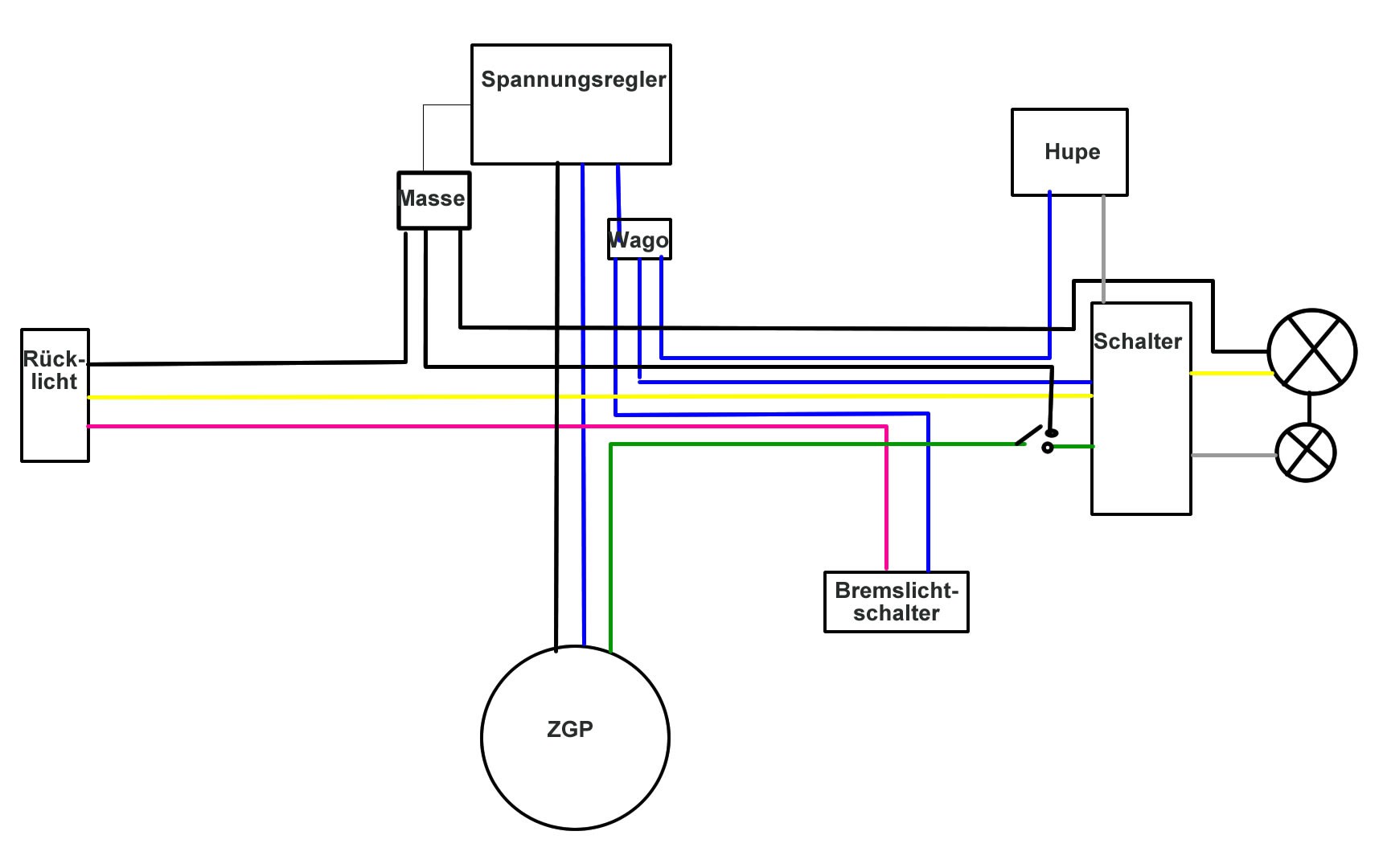 - Wenn ich die Hupe überbrücke mit Gelbes and Weißes Kabel am Schalter, dann Hupt die Hupe