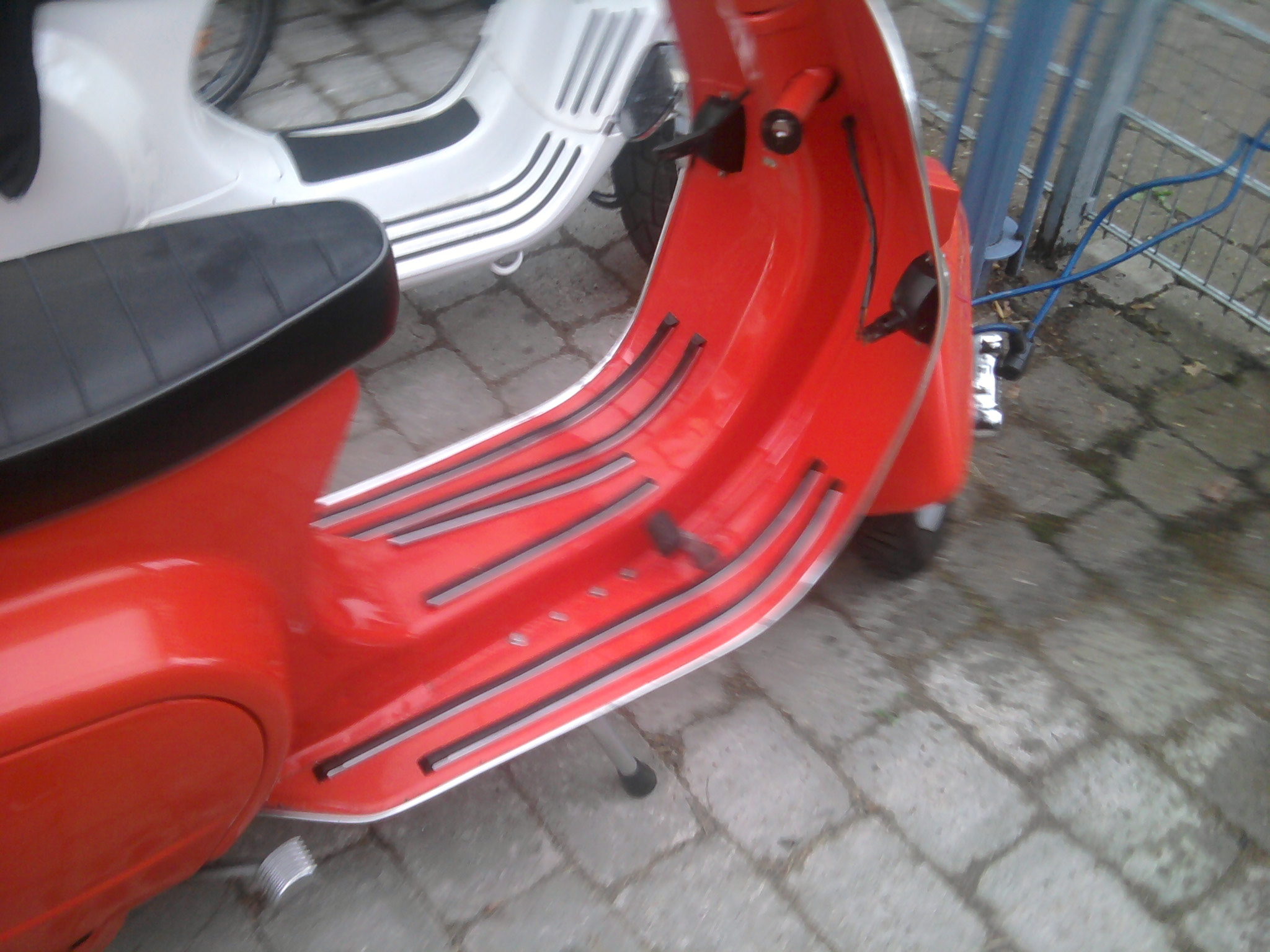 Hallo, ich habe bei der abgebildeten PX 80 lusso die Trittbleche geschweißt. Da sie noch komplett im O-Lack steht (und das soll so bleiben), möchte ich die geschweißten Stellen nur beilackieren. Es ist eine Vespa von 1990, gebaut in Deutschland.