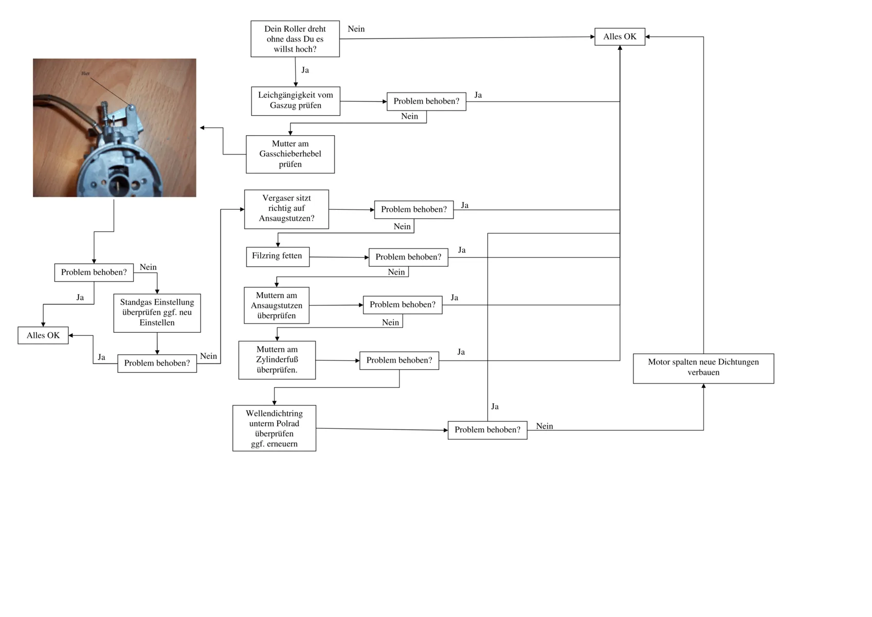 solltest Du die Sitzbank mal aufmachen und nachsehen ob noch alle Schrauben am oder im Vergaser sind und ob sie auch noch alle fest sind.