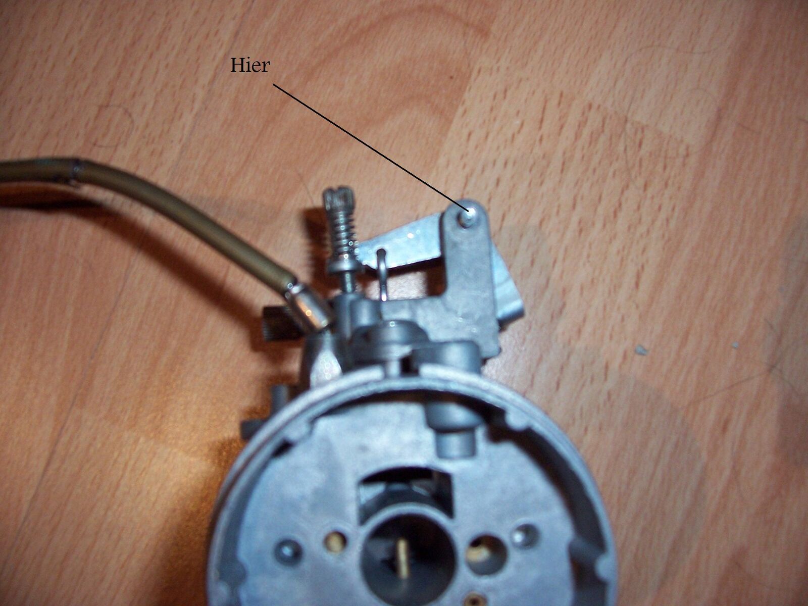 Ist das nicht der Fall dann schau mal ob der kleine Hebel, an dem der Gaszug eingehangen wird, sich noch normal bewegen lässt. Siehe Bild 1