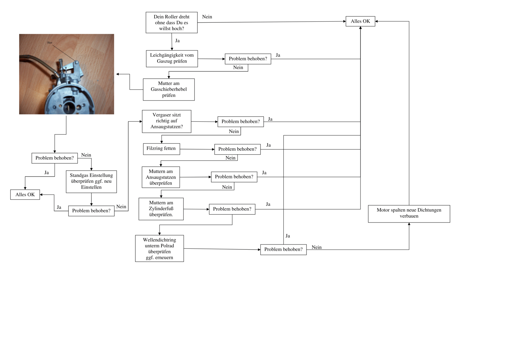 Wenn auch das nicht zum Erfolg geführt hat würde ich persönlich zuerst den Vergaser entfernen und dann den Ansaugstutzen. Diesen dann mit neuer Papierdichtung und Dichtpaste wieder an seine alte Position bringen und dann den Vergaser wieder richtig aufschrauben. Sollte der Fehler immer noch auftreten den Zylinder runter und mit neuer Dichtung und Dichtpaste wieder zusammenbauen.