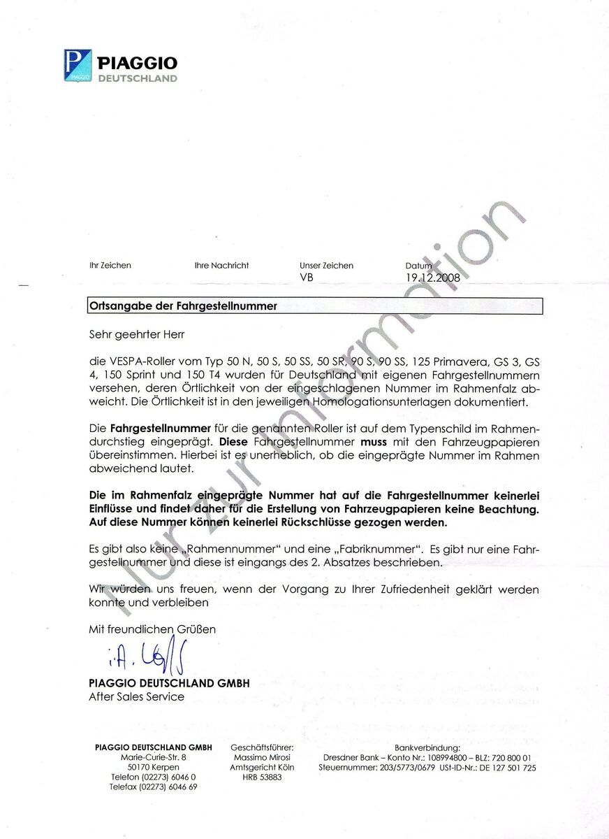 Beim TÜV, bei Verkehrskontrollen oder vor Behörden führt das manchmal zu Irritationen. Nur fachkundige Ansprechpartner wissen dann, dass durch die Vergabe einer FIN in Deutschland die im Rahmen eingeschlagene Rahmennummer zu einer Fabriknummer (Zitat Piaggio) wird, die keinen Identifikationscharakter hat. Damit das Argumentieren leichter wird, stellen wir Euch (danke an MBT / T4) hier eine Kopie eines Schreibens von Piaggio Deutschland zur Verfügung: