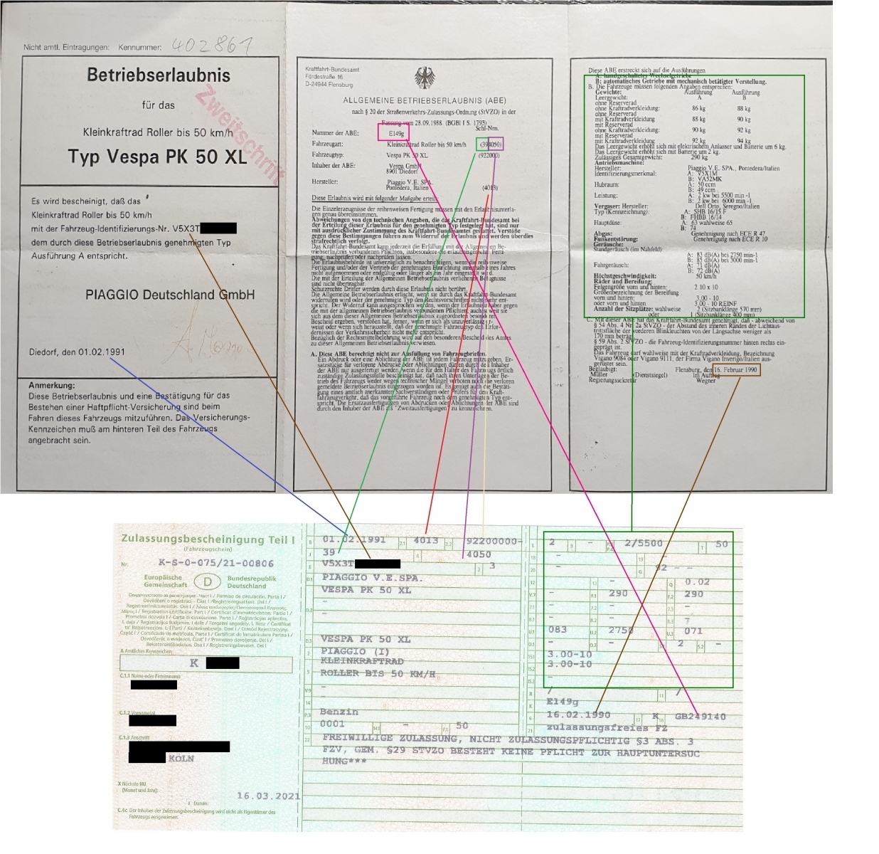 - Dieser Lexikon-Eintrag beruht auf meinen Erfahrungen, die ich bei der freiwilligen Zulassung meiner PK 50 XL 2 (BJ 1991), deutsches Modell, deutsche ABE in Köln gemacht habe. Andere Zulassungsstellen, andere Bundesländer können dies gegebenenfalls anders handhaben, auch wenn die rechtlichen Grundlagen einheitliches Bundesrecht sind.