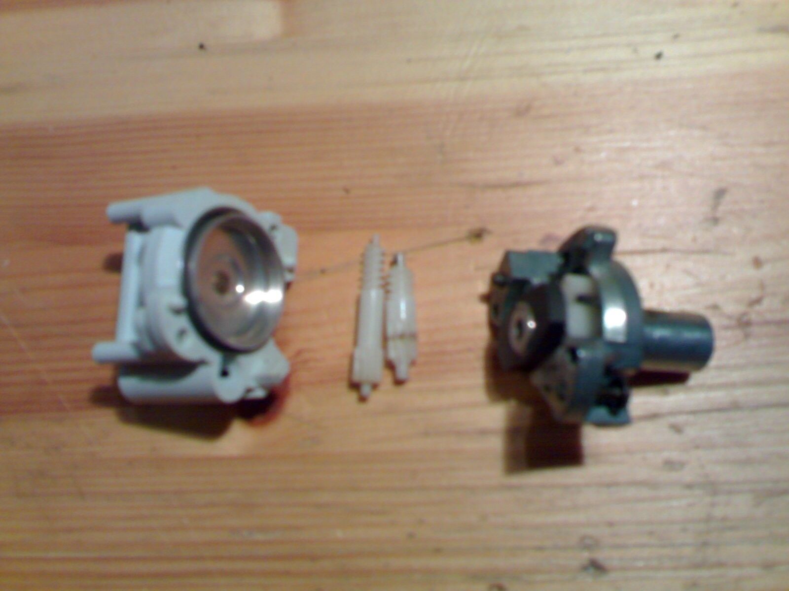 Dann Vorsichtig auseinander ziehen aber die Feder mit dem Metal vom Magnet gleich abnehmen wenn ihr mit euren Fingern hinkommt merkt es sofort wenn ihr es ausseinander zieht. Also nicht erschrecken wenn euch zwei weiße Plastikwellen rausfliegen die Dicke kommt an den Magneten und und der lange an das Teil wo die Feder ist findet es bestimmt wieder und falsch herum kann man es nich zusammen bauen