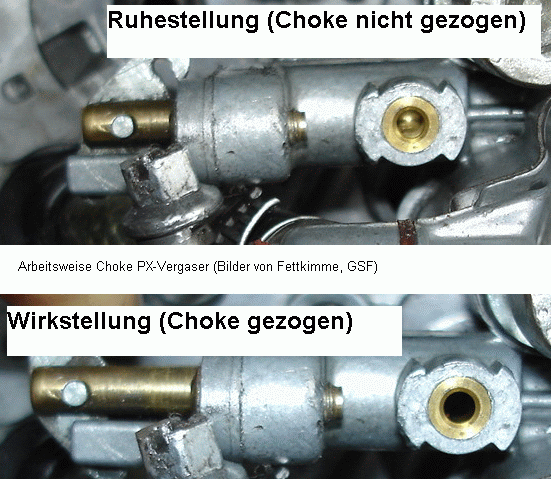 Damit hat man ein Sprit/Luft-Gemisch eingestellt, das bei kaltem Motor zu mager ist weil ein Teil des Sprits an den kalten Bauteilen im Kurbelgehäuse und den Überströmern etc kondensiert.