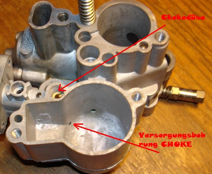 Dazu hat der SI-Vergaser eine komplett von der restlichen Spritversorgung unabhängige Chokedüse und einen komplett unabhängigen Sprit/Luftkanal der mit dem Choke geöffnet werden kann. Es wird zusätzlicher Sprit und auch etwas zusätzliche Luft der Verbrennung zugeführt die mit HD und ND nichts zu tun haben und auch nicht weiter geregelt werden können.