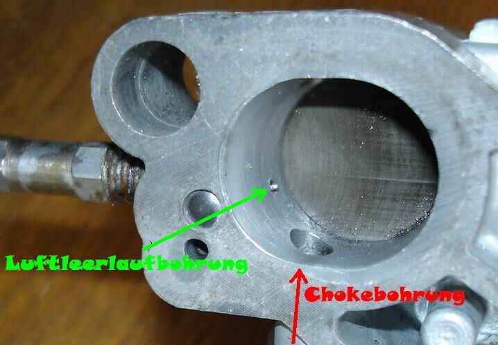 Die als "Leerlaufluftbohrung" bezeichnete Öffnung liefert nicht nur Luft. Sondern das ist das regelbare Ende des LLD/ND-Kanals. Über diesen Kanal erhält der Roller ein, von der LLD/ND vorgemischtes, Sprit/Luftgemisch im Leerlauf (Standgas). Dieses vorgemischte Sprit/Luftgemisch ergibt mit dem Luftstrom im Ansaugrohr die für die Verbrennung notwendige Sprit/Luftmischung.