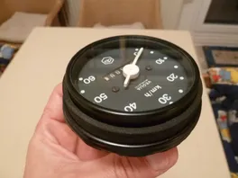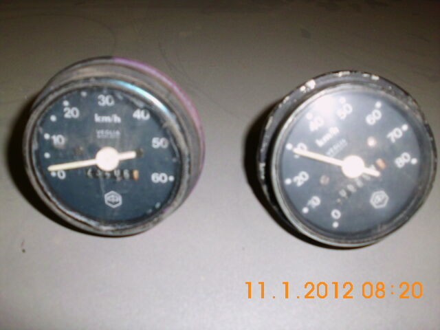 Preis knapp € 20 (inkl. Versand) mit defekten Tachoglas und steckender Tachonadel, überjauchten Gehäuse und abgebrochener Gehäusefüße, Lackabplatzer am Ring (daher zwei Tachos)