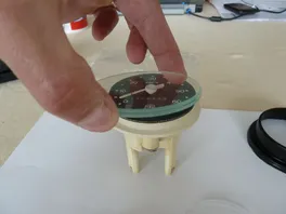 Vom Glaserer habe ich mir zwei Gläser (in der Stärke 2mm) mit den Durchmessern 66,5mm und 64,5mm anfertigen lassen und verkleben lassen. Dadurch habe ich den abgesetzten Rand erhalten und Stärke des Glases ist nicht merkbar. Dieses Glas gehört dann im Randbereich versiegelt (Objektivlackklarlack bzw. natürlich auch Silikon). Silikon aber vorsichtig auftragen sonst putzt man halt dementsprechend lang.
