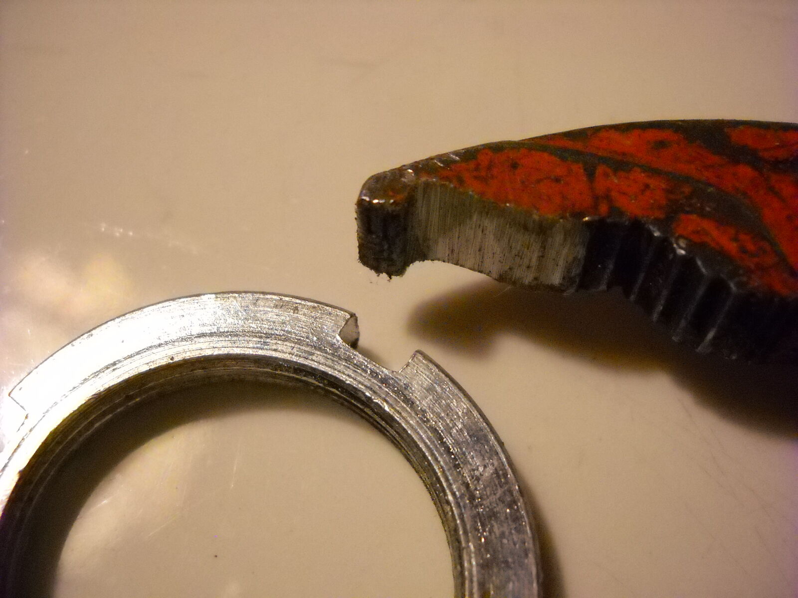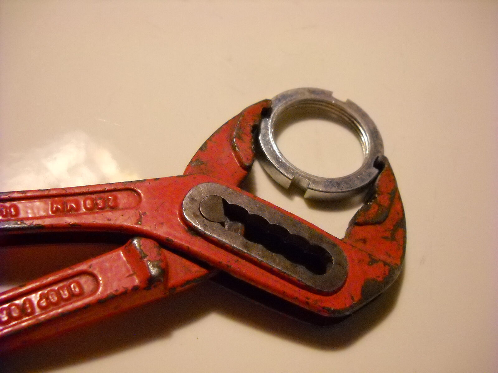 Wenn wir die Lager für die Gabel wechseln , müssen wir danach das Spiel wieder genau einstellen und mit dem Feststellring gegenkontern. Da dieser Ring vier Nuten besitzt , können wir eine Wasserpumpenzange mit der Flex so umarbeiten, das die Zange genau in die Nuten passt und somit kann der Feststellring des oberen Gabellagers mit aller Kraft fest gekonntert werden .