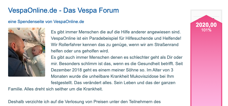 Daher wird Anfang April https://www.vespaonline.de mit https://www.vespaforum.com zusammengelegt zu einem Forum für Elektroroller. Es wird noch eine Unterkategorie für euer geliebtes Altblech geben. In welcher Größe muss aber dann noch definiert werden. In jedem Fall werden die alten Beiträge in einem Archiv gespeichert und können bei Bedarf als komprimiertes Datenverzeichnis heruntergeladen werden.