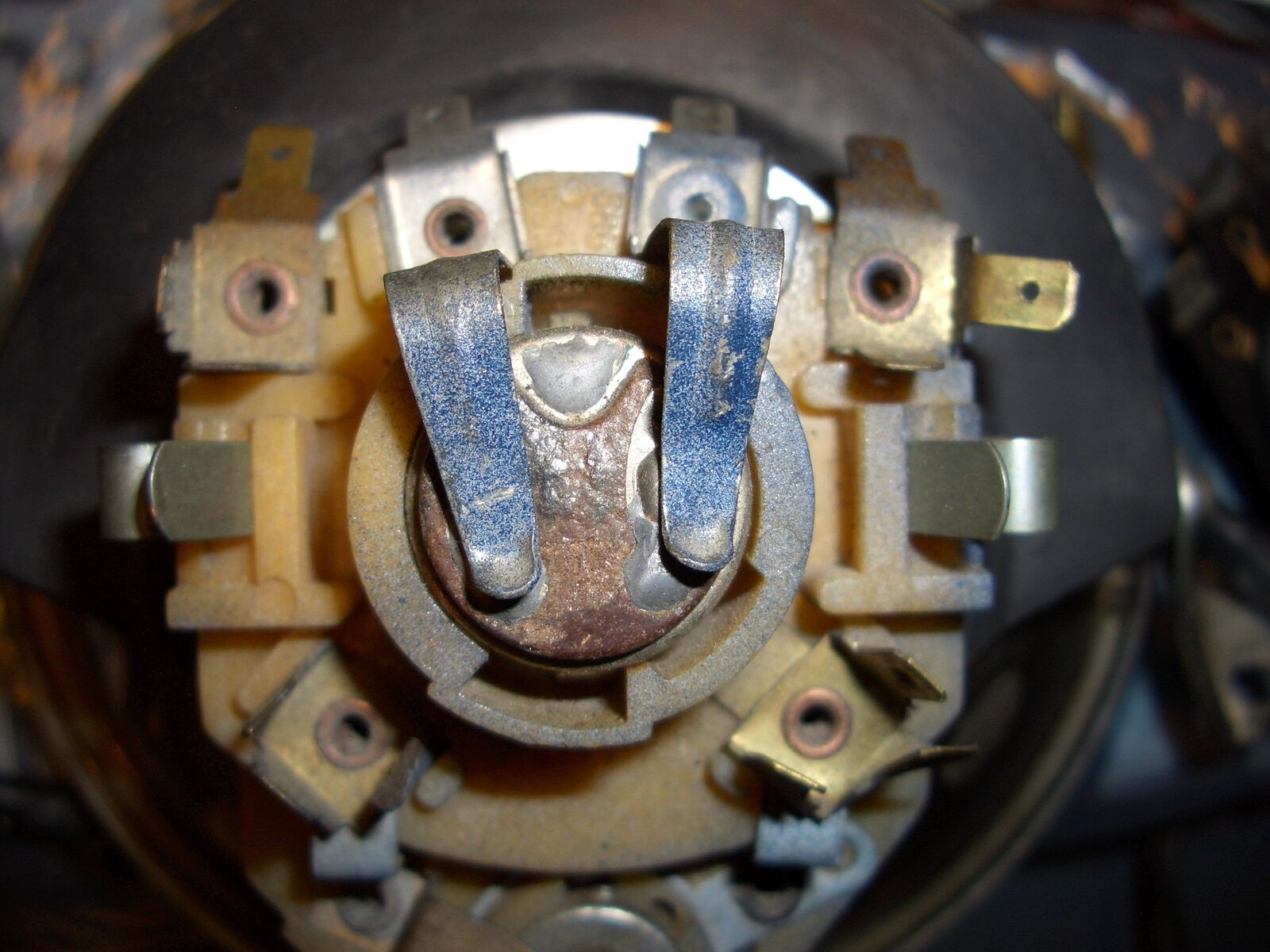 Meine Px ist Baujahr 81, hat Aussenverschlüsse, Batterie, ein rundes Blinkerrelais mit 2 Polen und einen Gleichrichter (siehe Fotos oben, das sind die vor der Renovierung). Die Zündgrundplatte hat 7 Kabel.