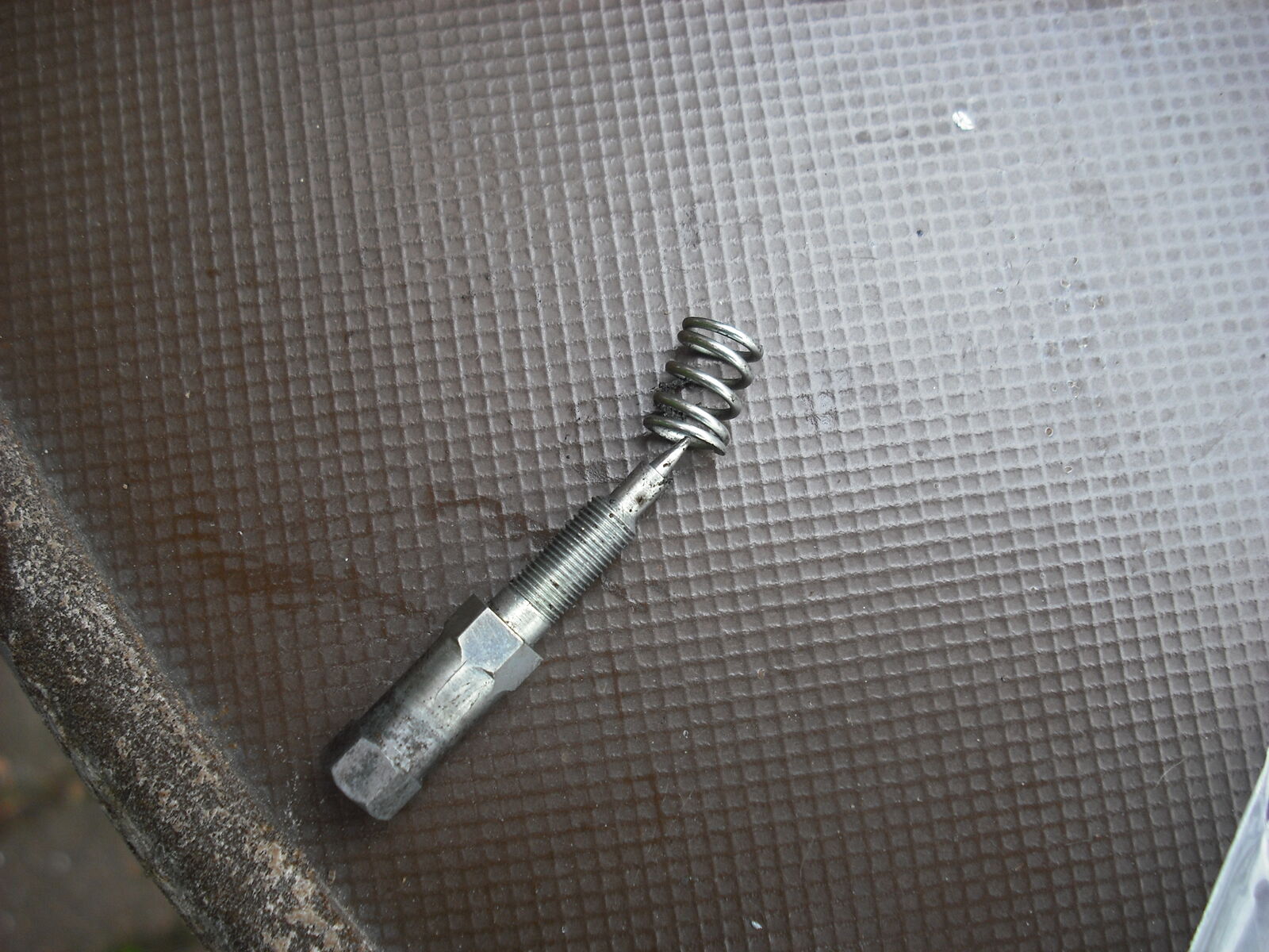 1. Als ich die Vergaserwanne rausgenommen habe, fiel eine Feder raus. Gehört die zu dieser Schraube? Und ist das die Gemischschraube?