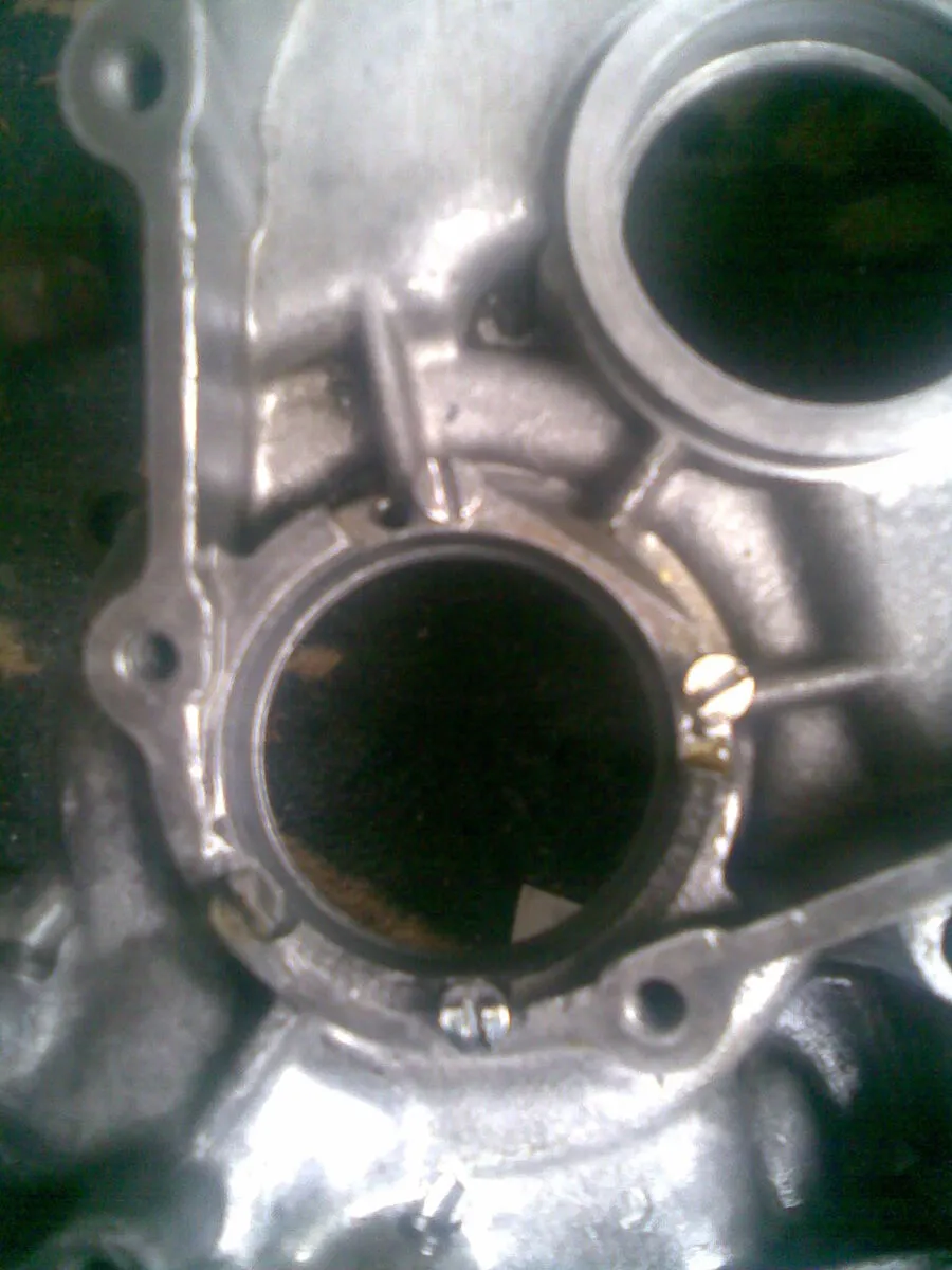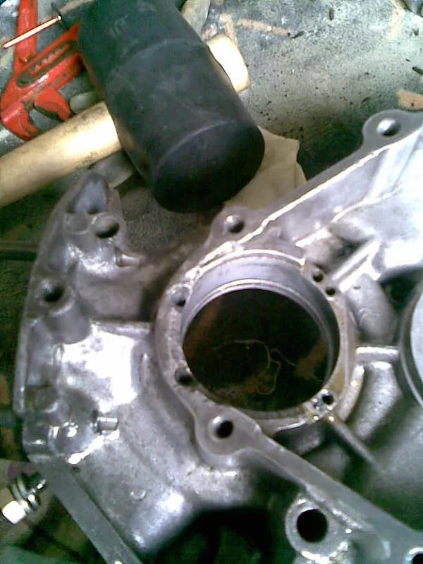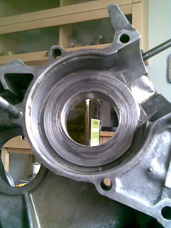 Ich frag mich, ob da mal rumgemurkst wurde, da auf der Außenseite des Kurbelwellengehäuses zur Kupplung hin die Dichtfläche halbrund um das Lager rausgebrochen aussieht, dafür aber kleine Schrauben in den rausgebrochenen Teil der Dichtfläche geschraubt wurden, auf die dann Dichtmasse gemacht wurde, sieht aus wie Dichtflächenersatzmaßnahme und Lagerfixierung zugleich. Ganz komisch auf jeden Fall.