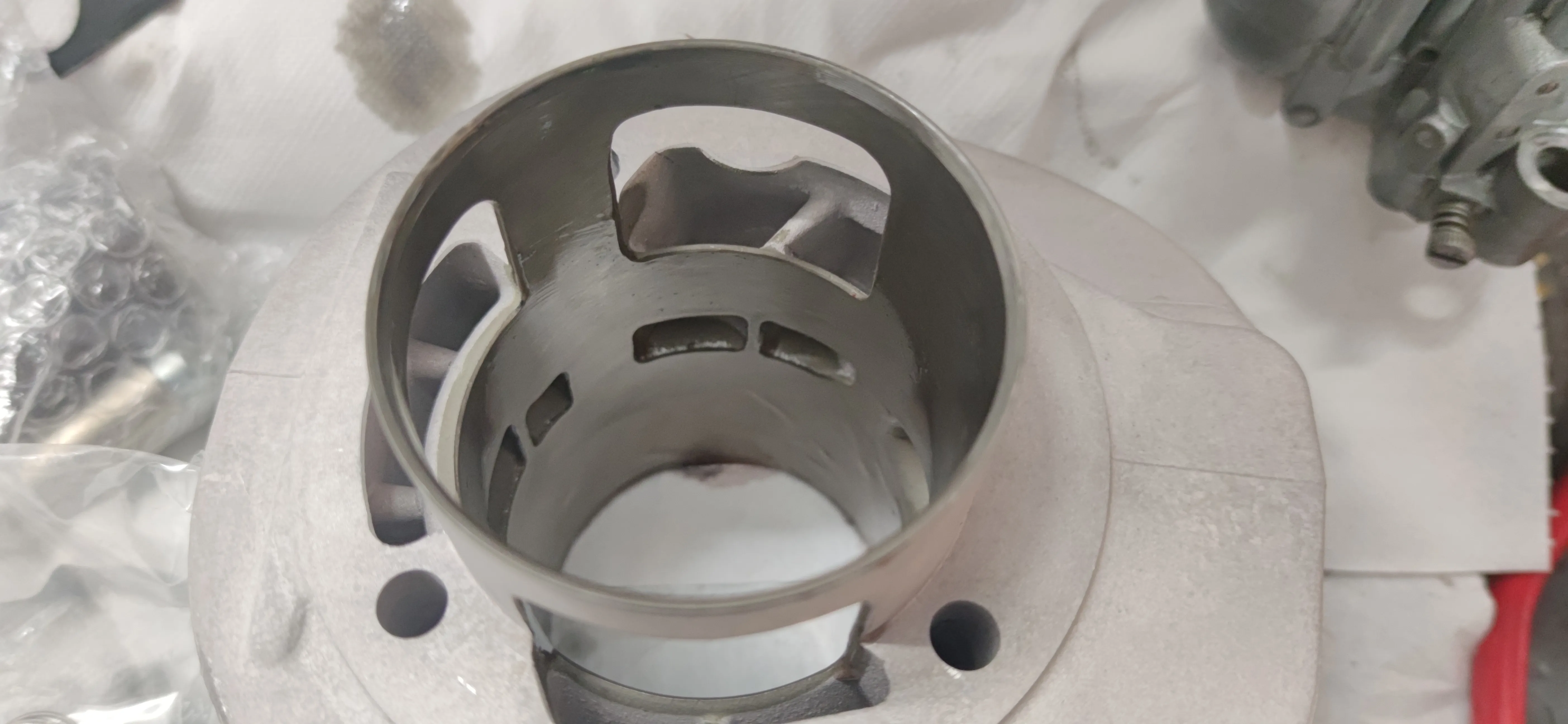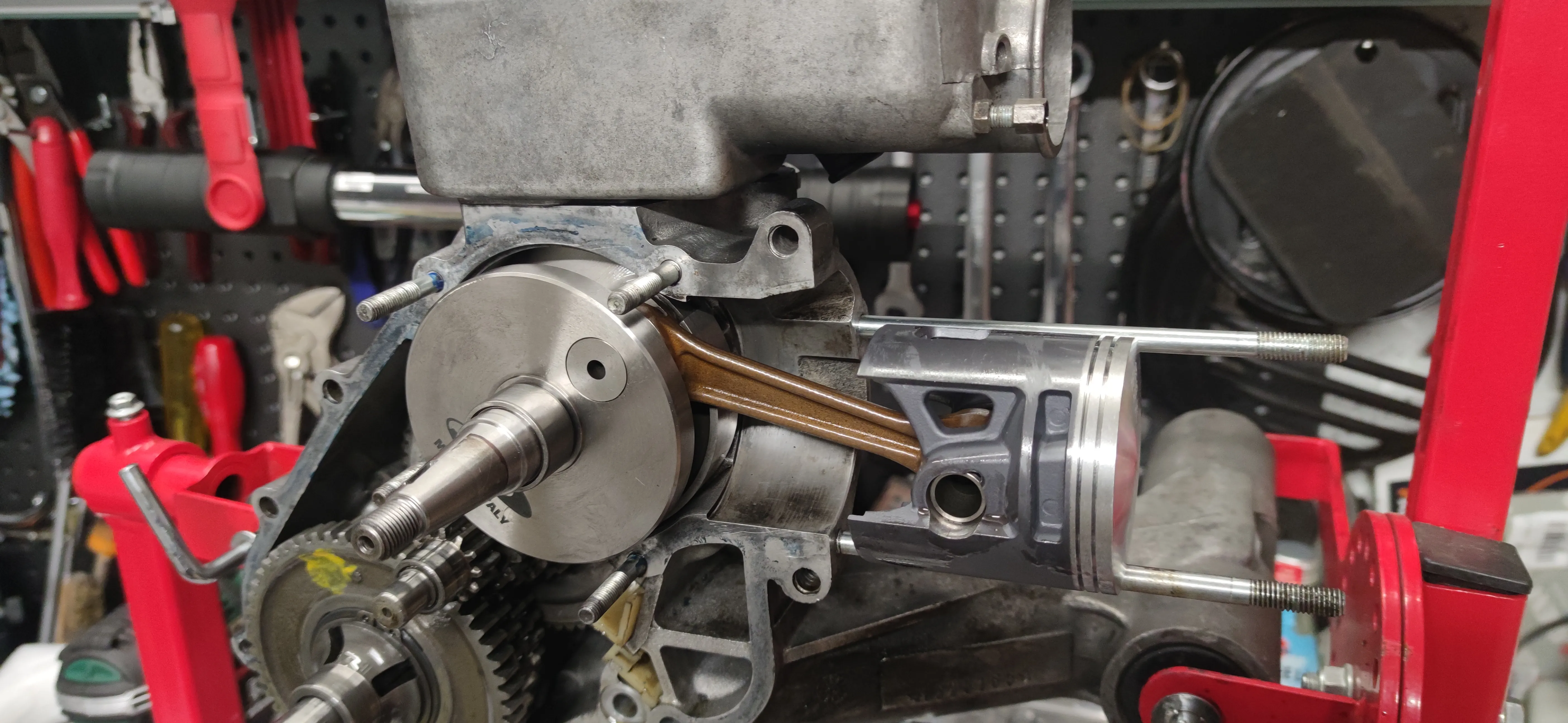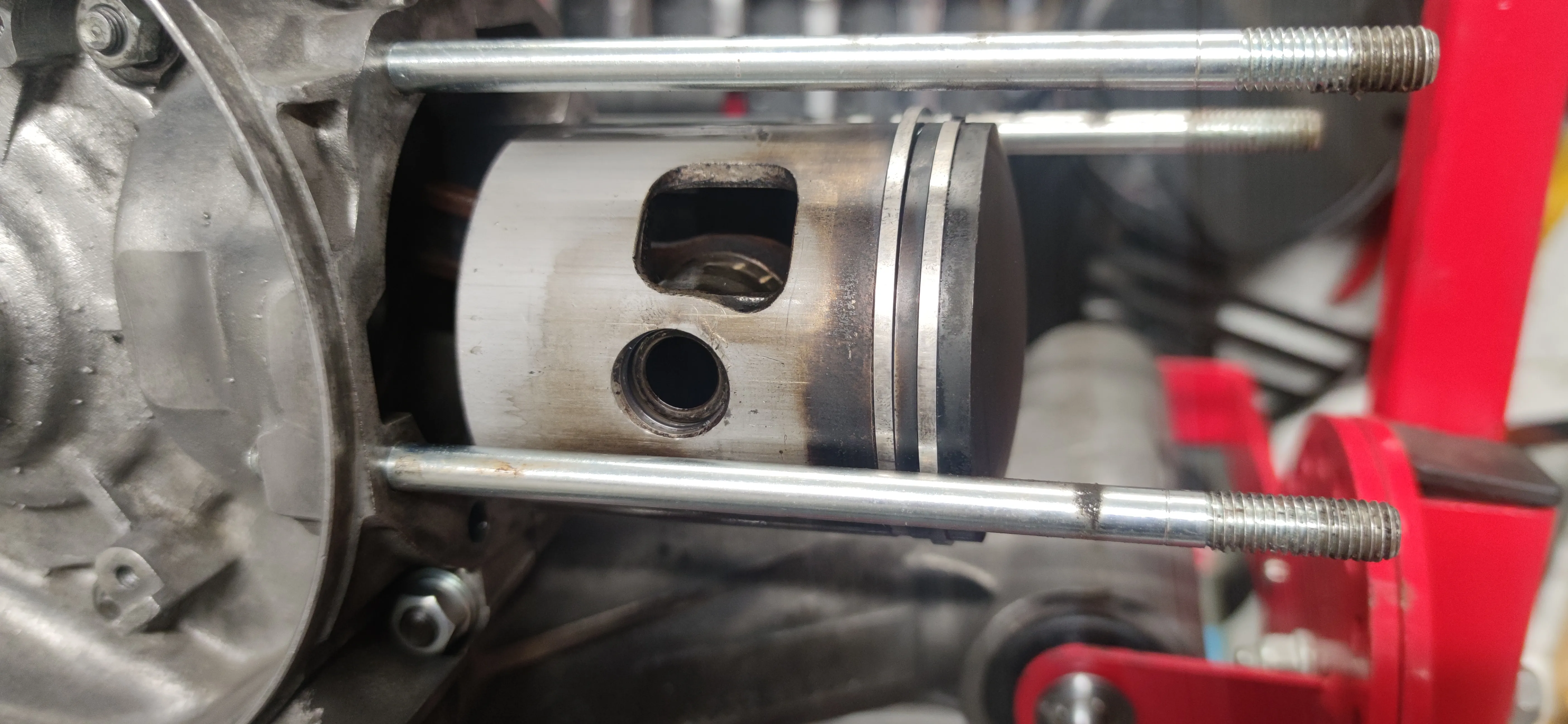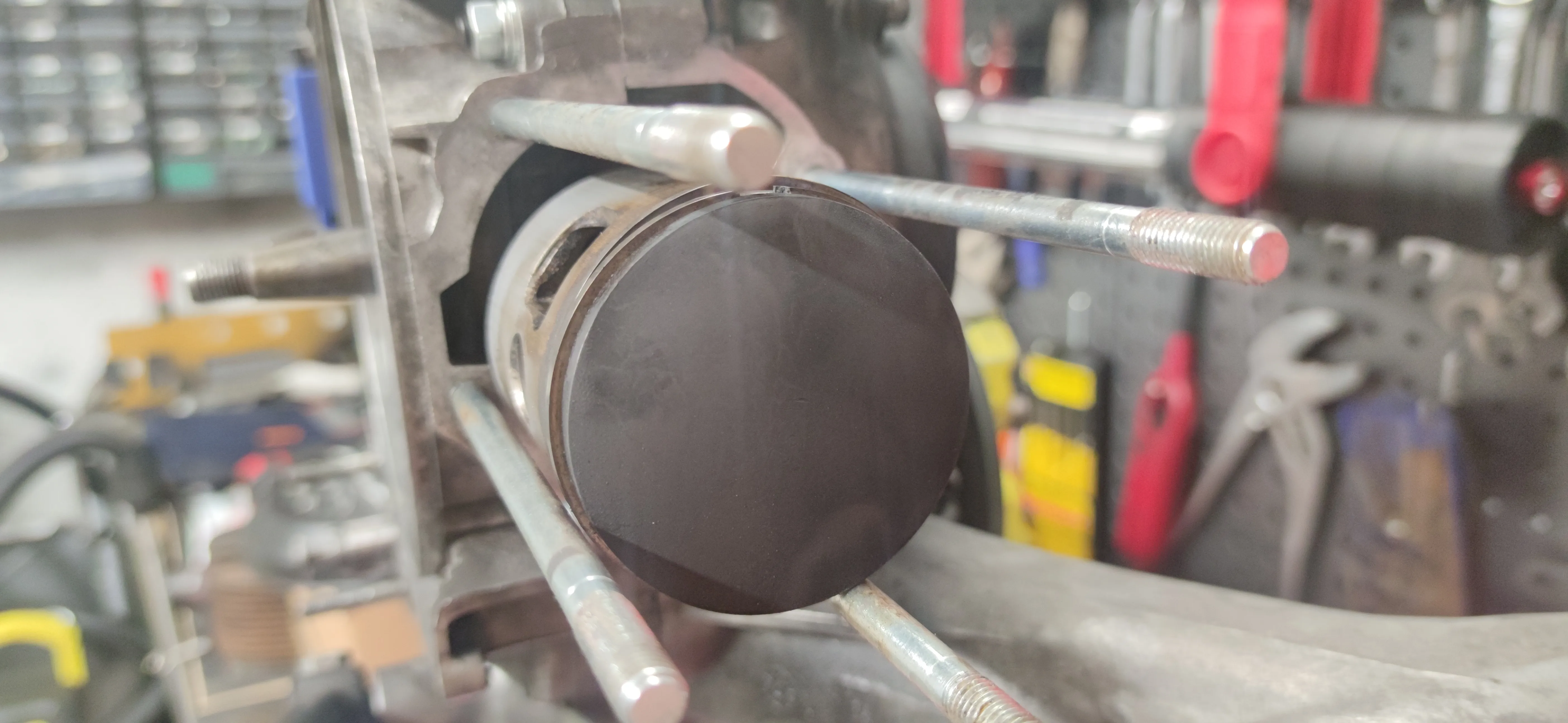 Um die Steuerzeiten vernünftig messen zu können, habe ich den Vergaser entfernt und den Kolben ohne Kolbenringe und den Zylinder auf die große Motorhälfte gesteckt.