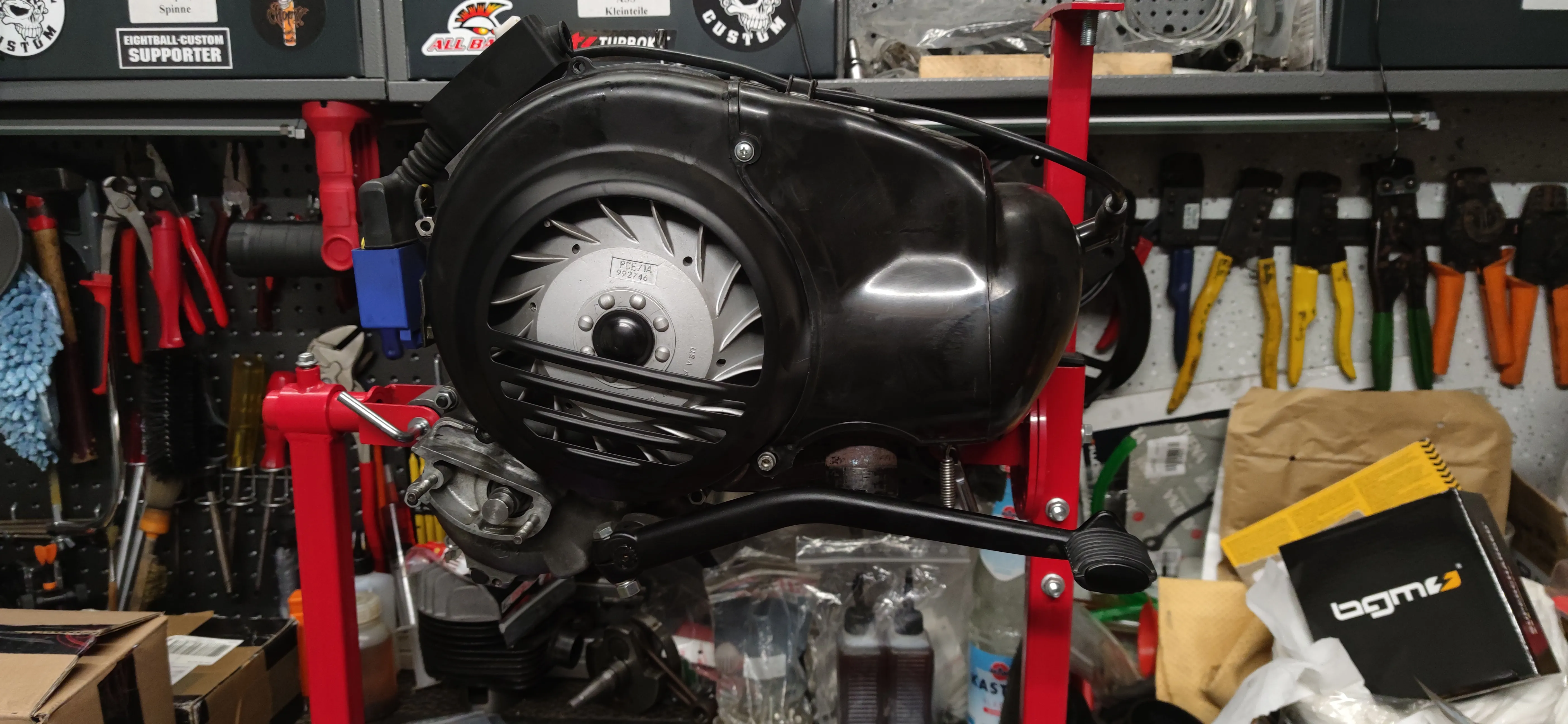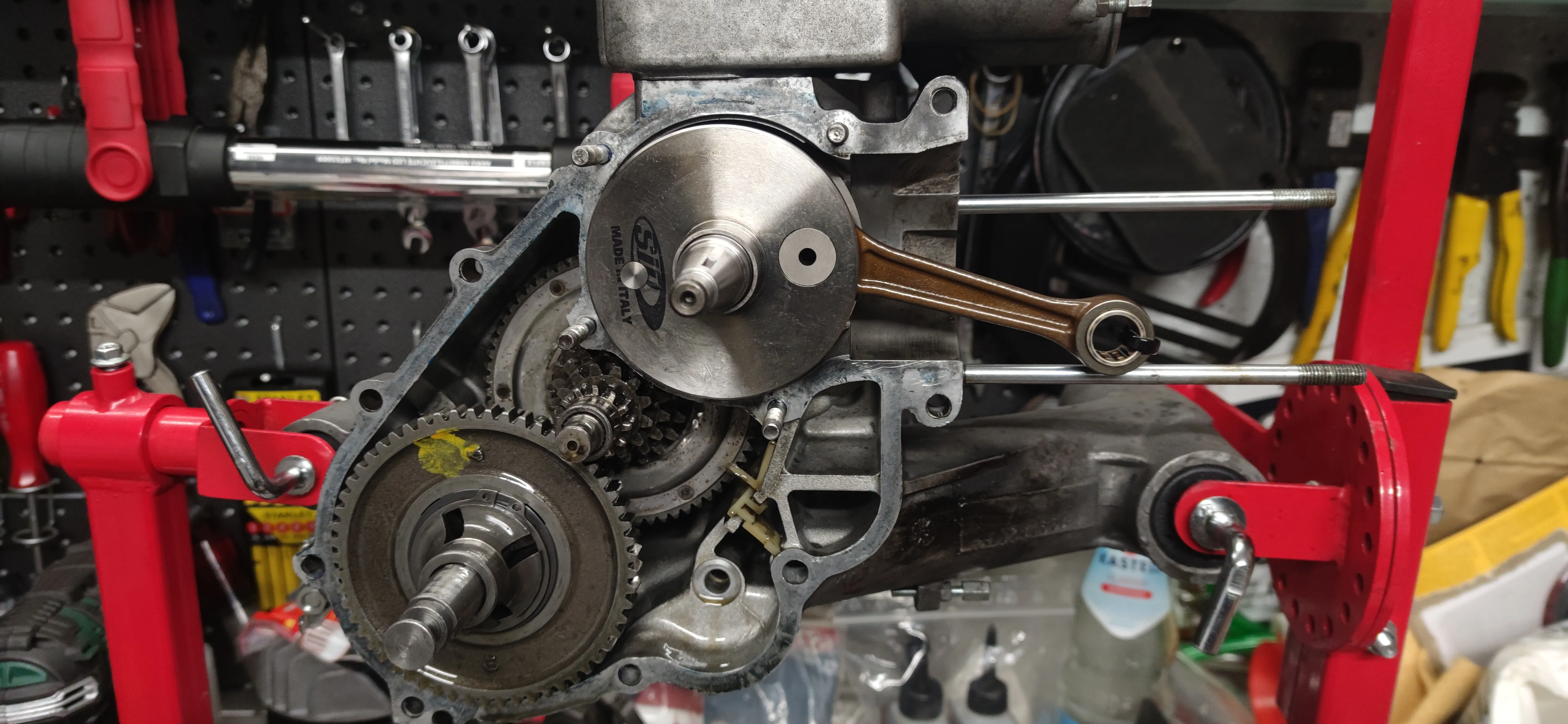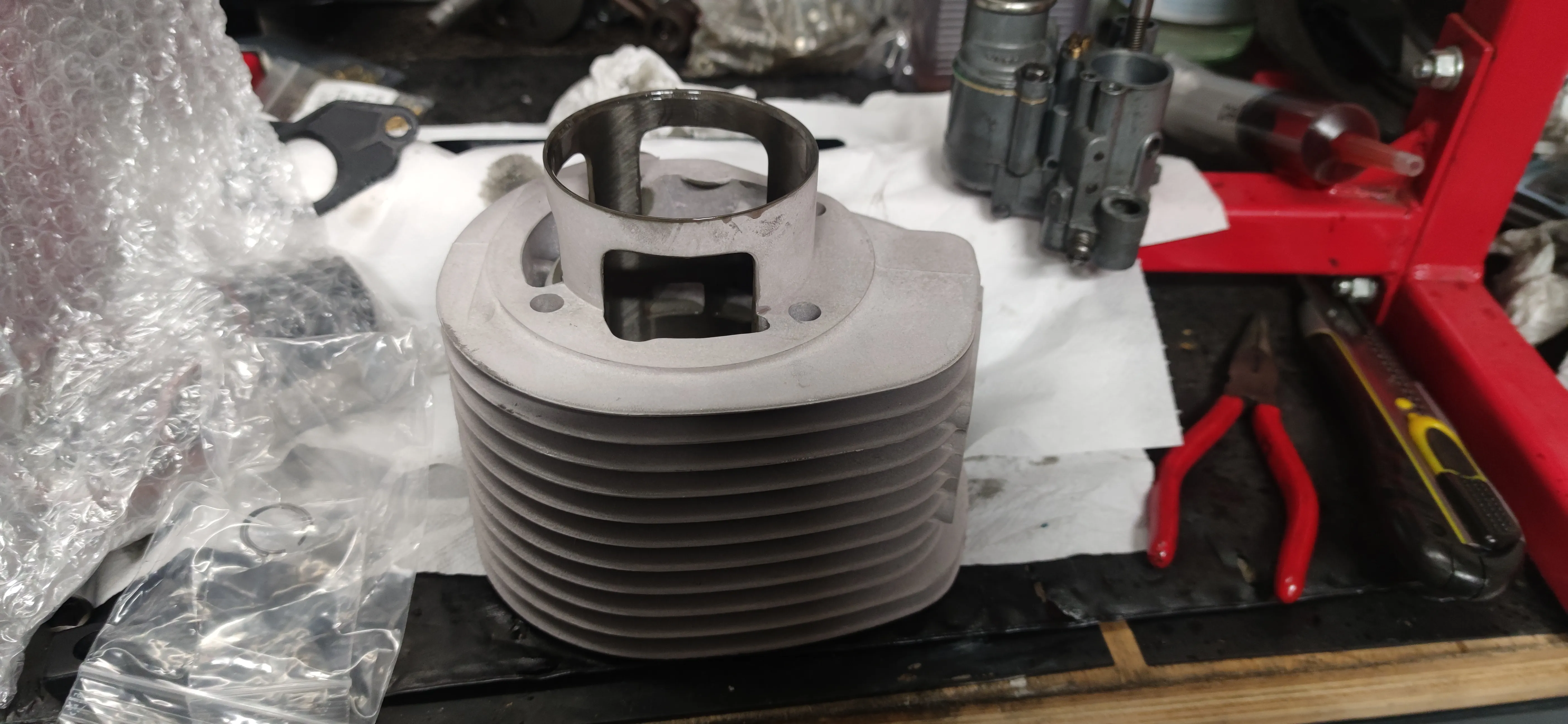 Um die Steuerzeiten vernünftig messen zu können, habe ich den Vergaser entfernt und den Kolben ohne Kolbenringe und den Zylinder auf die große Motorhälfte gesteckt.