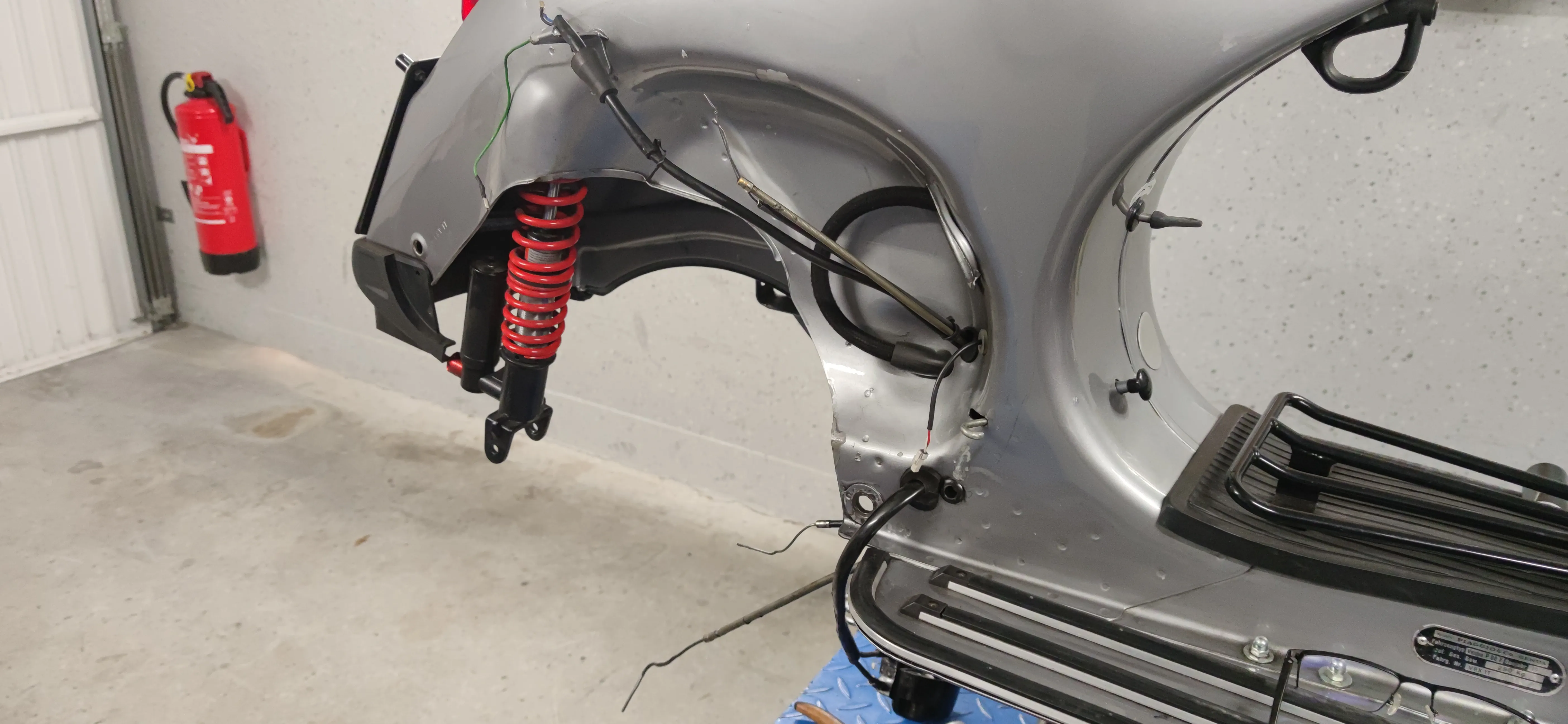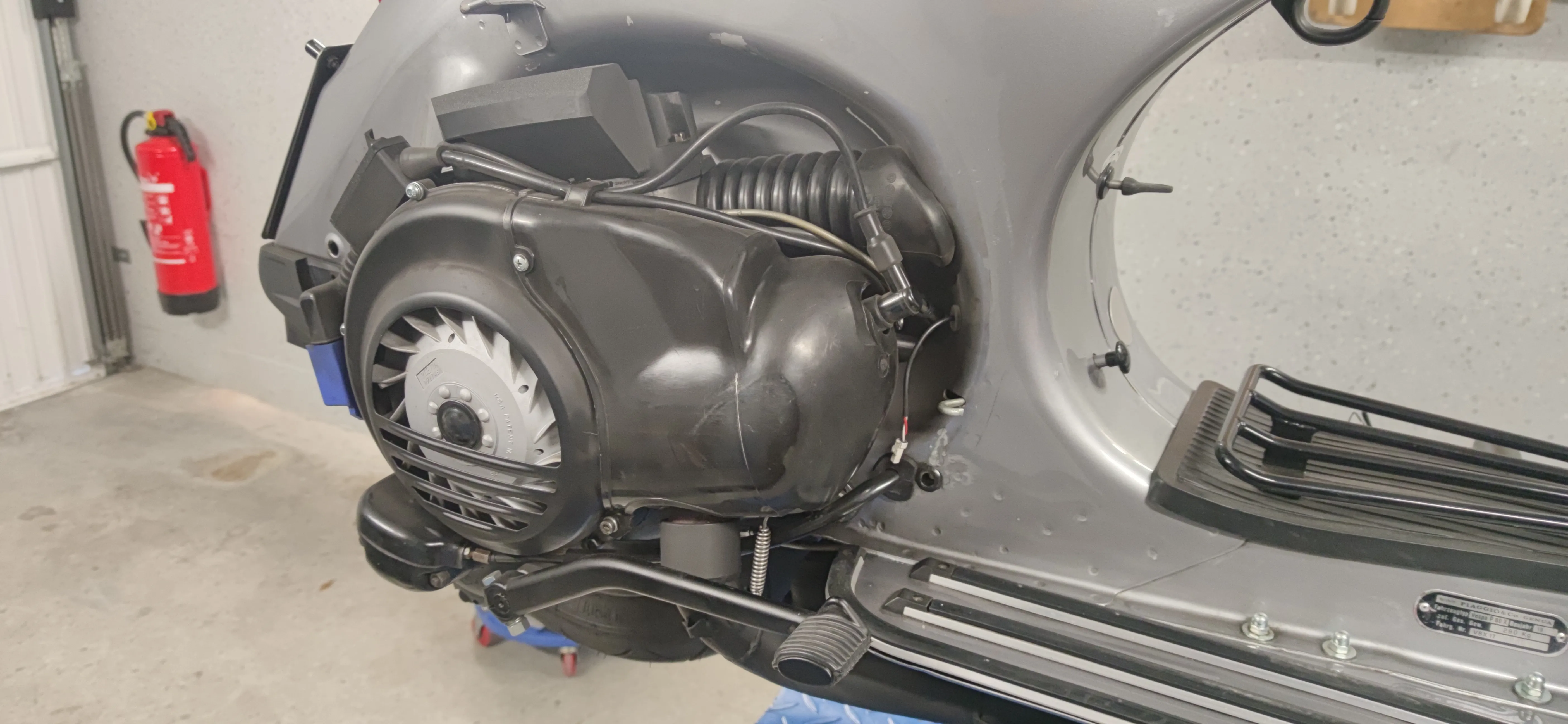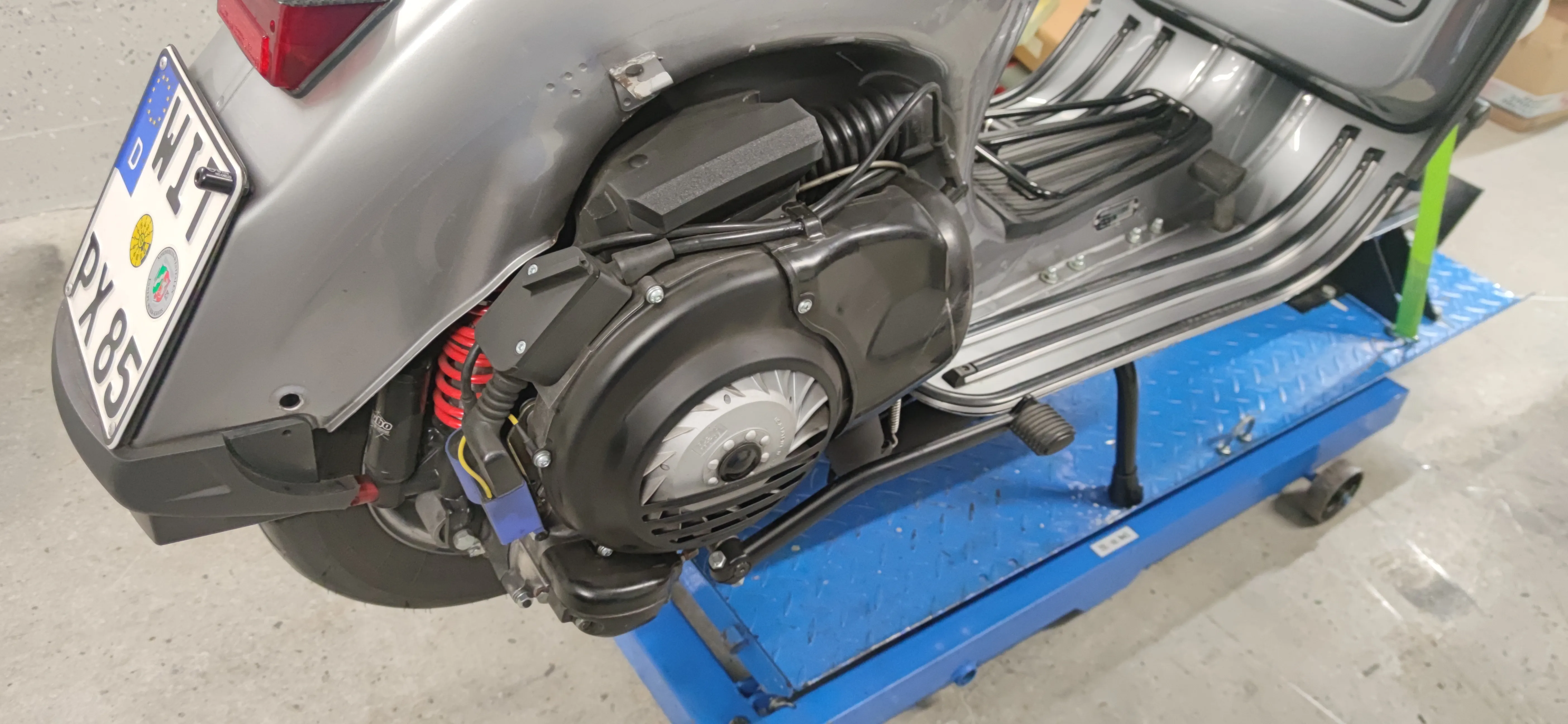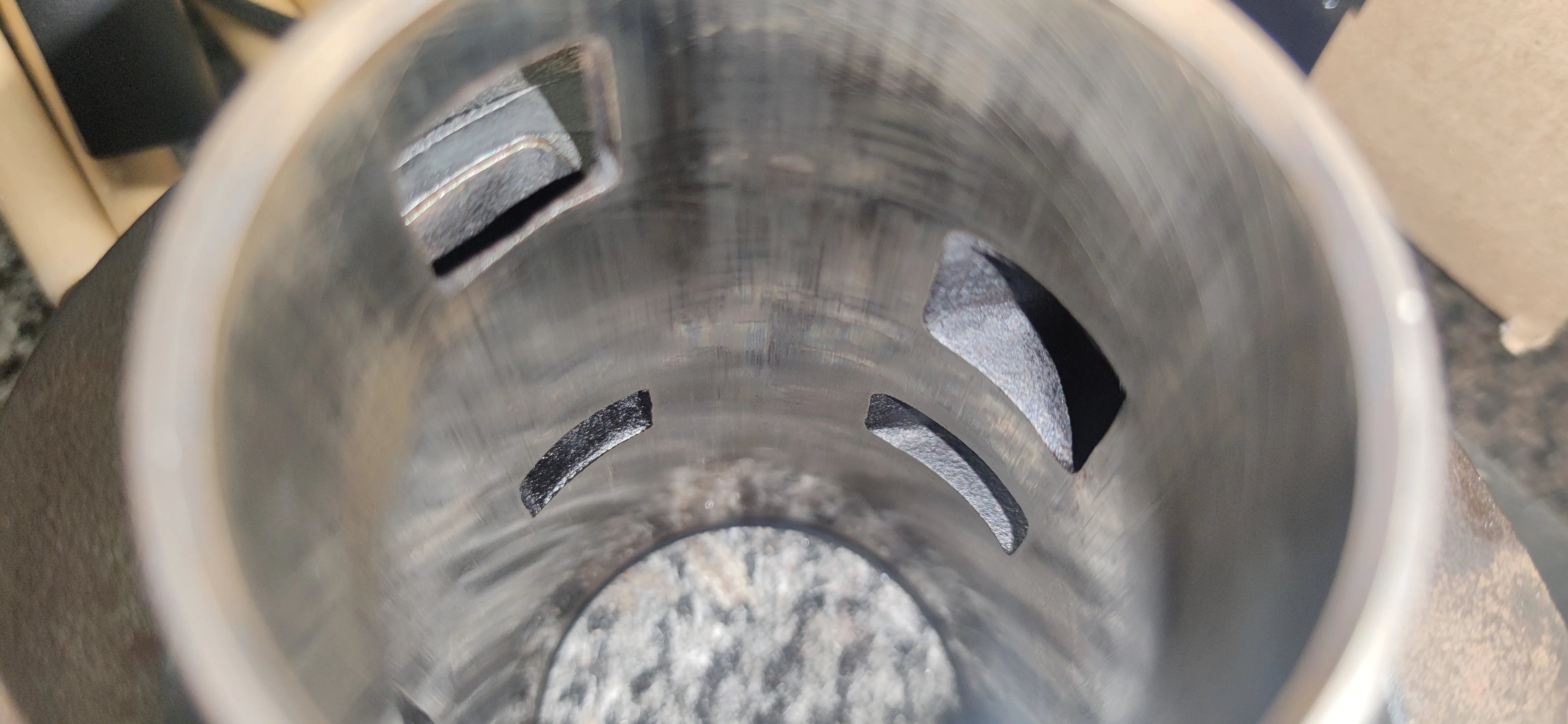 Um die Steuerzeiten vernünftig messen zu können, habe ich den Vergaser entfernt und den Kolben ohne Kolbenringe und den Zylinder auf die große Motorhälfte gesteckt.