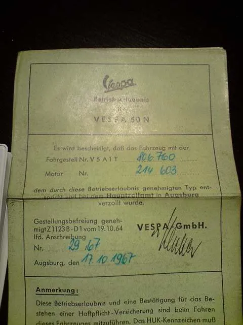 Grund: Die Motor- und Fahrgestellnummern sind auf dem Schild am Rahmen und dem Brief identisch. Nur das Datum ist unterschiedlich: In meinen Papieren steht 1967 (siehe Bild) und auf dem Typenschild steht 1968.