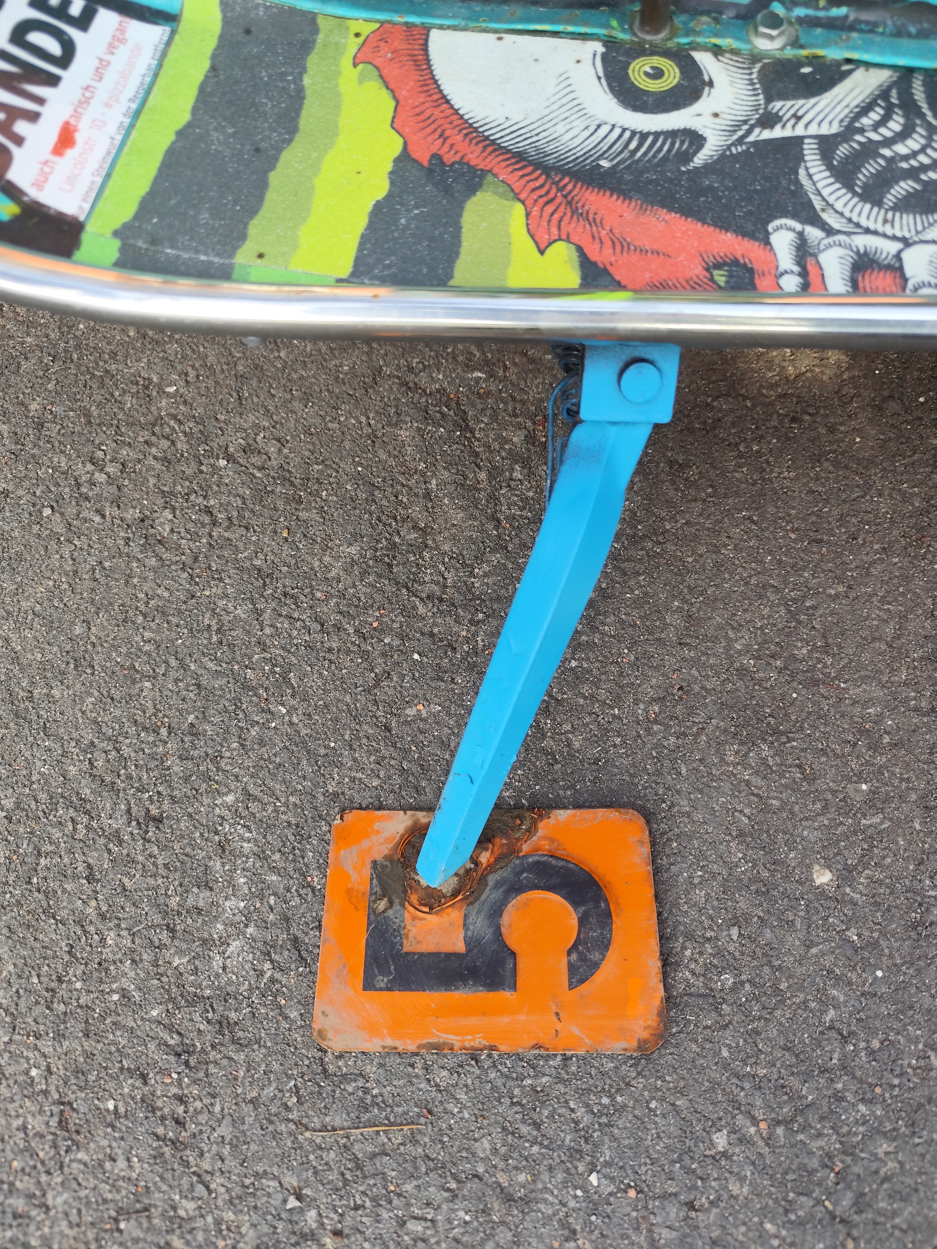 Und den Seitenständer habe ich auch dran geschraubt. Am Trittbrett ist ein massives Edelstahl Schlitzrohr. Das sollte den Trittbrett genug Stabilität geben damit das Grade bleibt. Hoffe ich... Und für weichen Untergrund kommt ne 5 drunter. Ist von ner alten Gefahrgut Tafel.