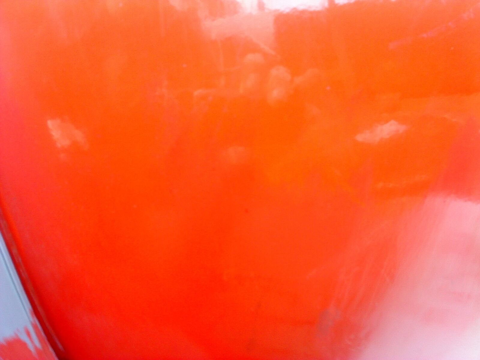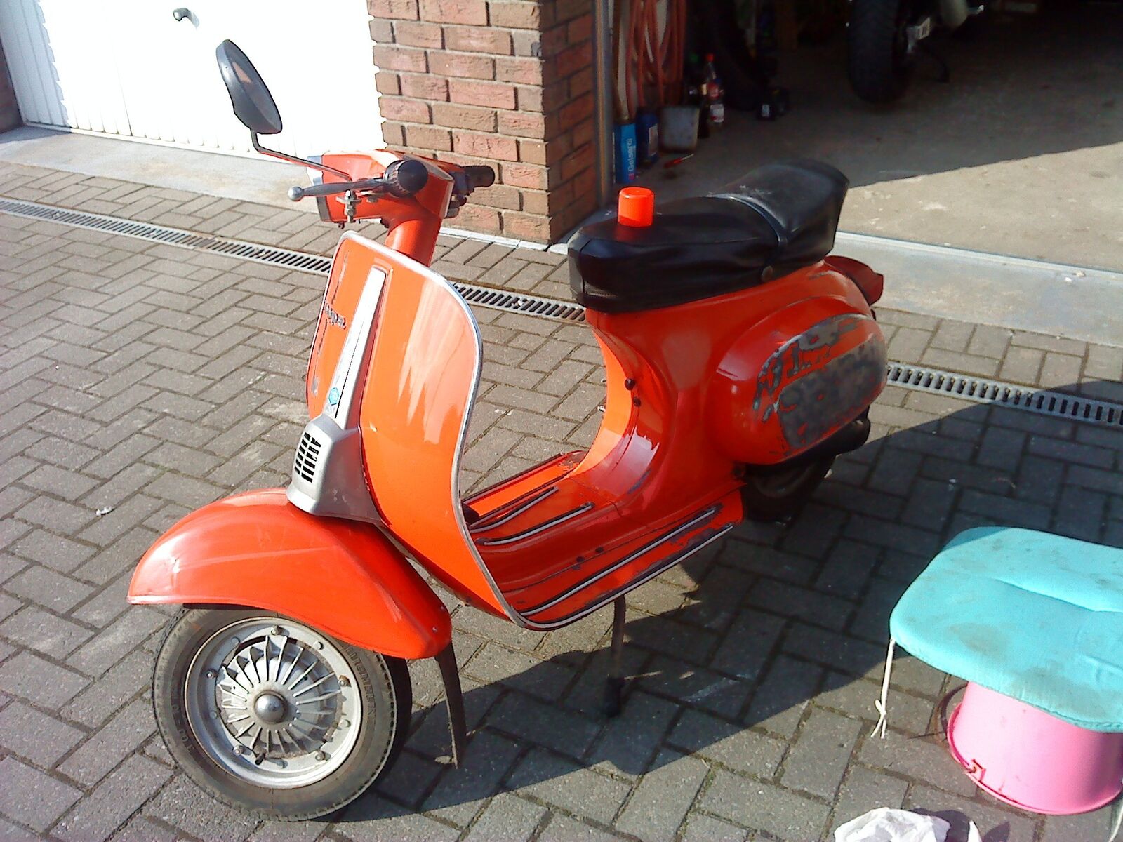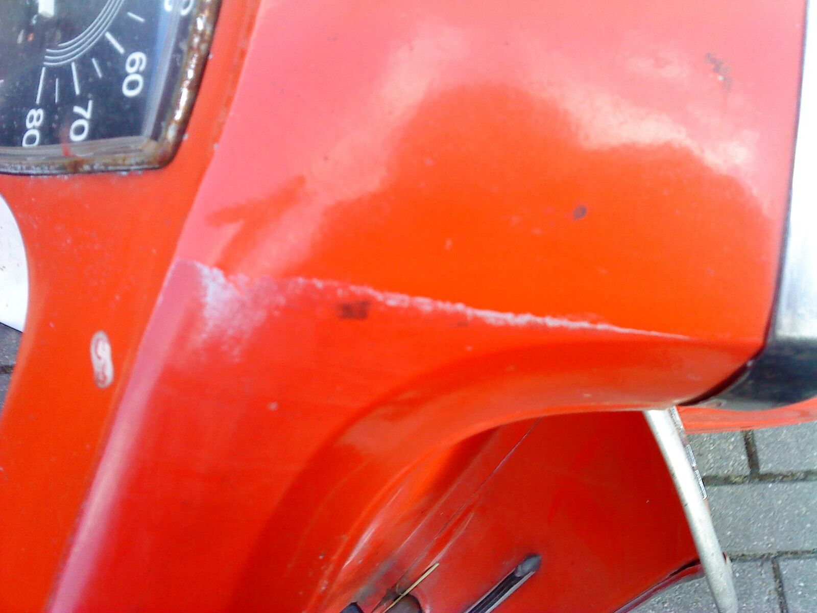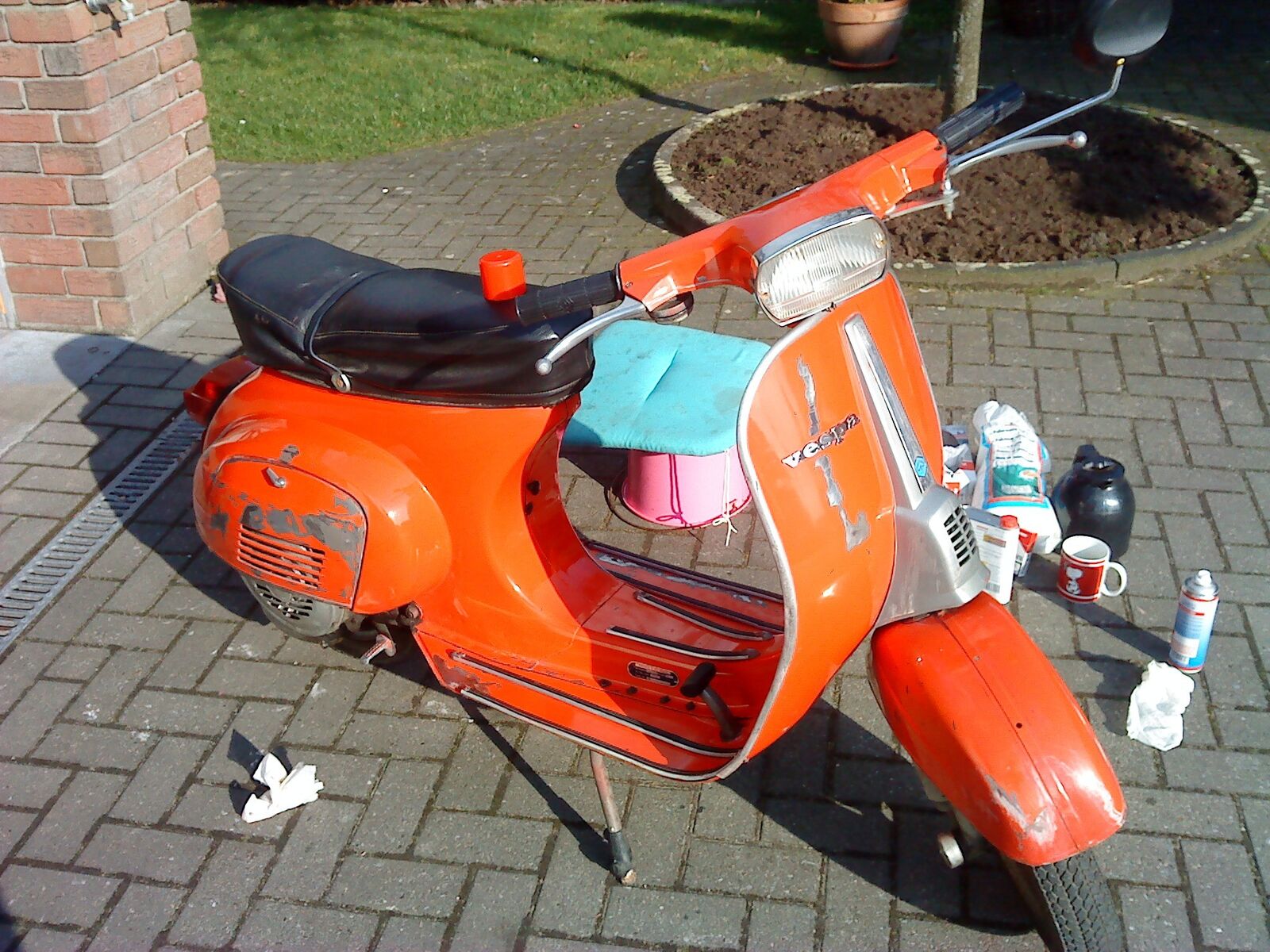 Die Vespa ist rot angestrichen und hier und da schimmer ein wenig Orange durch.
