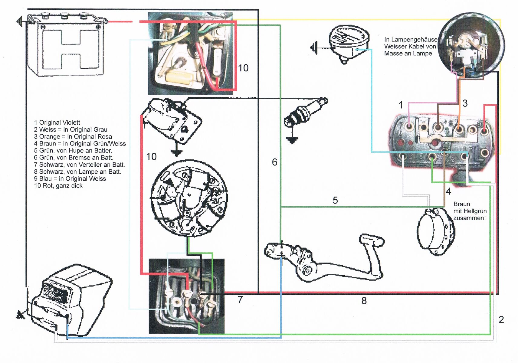 Außerdem habe ich die Klemmen 2 und 8 vertauscht. Ohne Batterie verlagert sich das Problem der Überspannung auf das Standlicht. Aber mit Batterie fliegen an dieser die Funken. Also gehe ich davon aus daß der Scooterhelp-[lexicon='Schaltplan',''][/lexicon] in Bezug auf die Anschlüße 2 und 8 falsch ist. -
