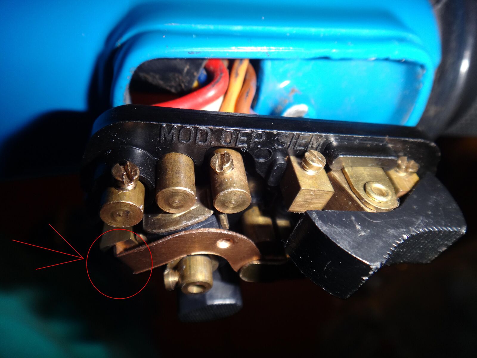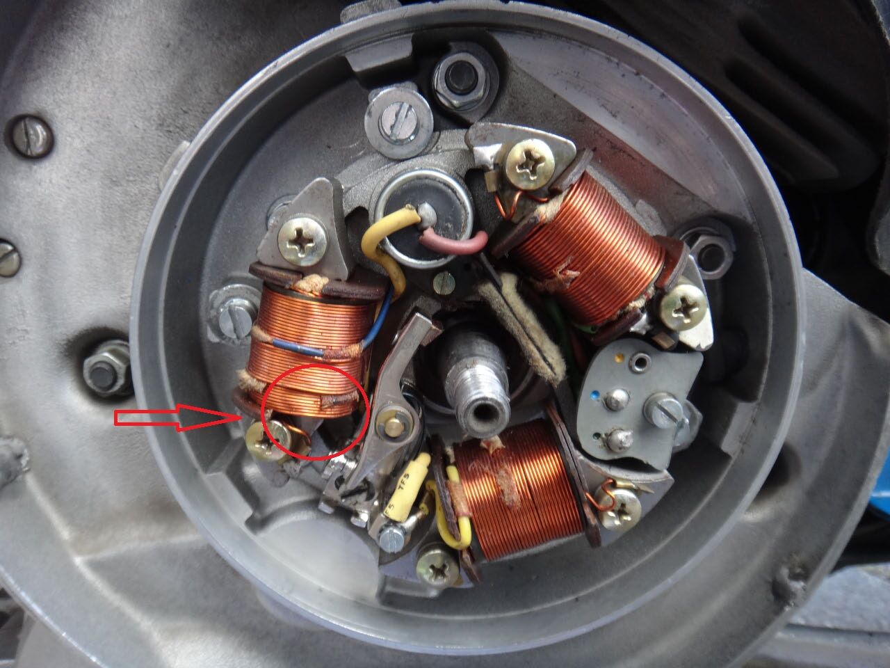 1. Ich habe die Widerstände der 3 Spulen der LIMA durchgemessen und jeweils einen kleinen Widerstand gemessen (um 2 Ohm). Die Spulen sowie die Kabel sind nach Augenprüfung in Ordung, bis auf ein abgebrochenes Isolatorstück (siehe Foto).
