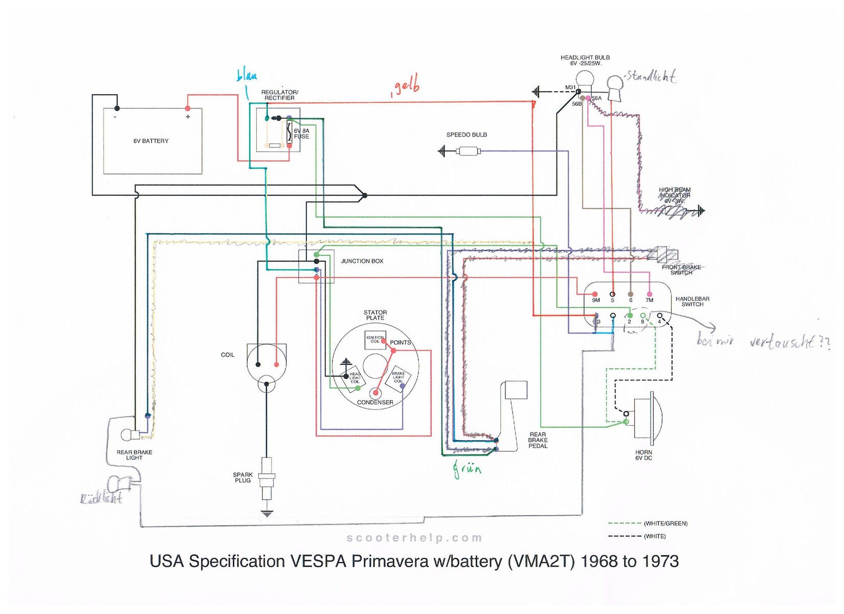 Kann es sein dass dadurch die Spule zu viel Leistung abgibt und deshalb zu viel Spannung nachher an den Verbrauchern anliegt? Gibt es eine Möglichkeit die Leistung der Spulen zu bestimmen?2. Bei Scooterhelp habe ich einen [lexicon='Schaltplan',''][/lexicon] gefunden der meinem am nächsten kommt: Schaltplan. Folgende Unterschiede gibt es: Das komische "Front Brake Switch" muss man sich wegdenken, das Rücklicht dazudenken, an Klemme 5 kommt das Kabel des Standlichts, das gelbe Kabel an Klemme 3 ist mit dem gelben Kabel oben links an der Gleichrichterbox verbunden anstatt mit dem Bremslicht und das blaue Kabel der Tachometerleuchte ist zusammen mit dem fehlenden grauen Kabel des Rücklichts an Klemme 1. Das alles verstehe ich ja noch. Jedoch sind bei mir die Kabel an den Klemmen 2 und 8 vertauscht, also entgegen des Scooterhelp-Schaltplans ist das grüne aus dem Verteiler mit Klemme 8 und das weiss/grüne mit Klemme 2 verbunden. Was ist denn nun richtig? Mein Schalter ist diser hier: Schalter.