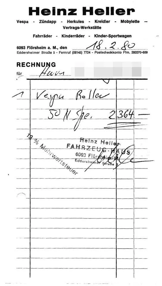 Die Vespa wurde im März 1980 beim Piaggio Händler gekauft und hat damals 3.200,-- DM gekostet. Entspricht 1.636,-- €