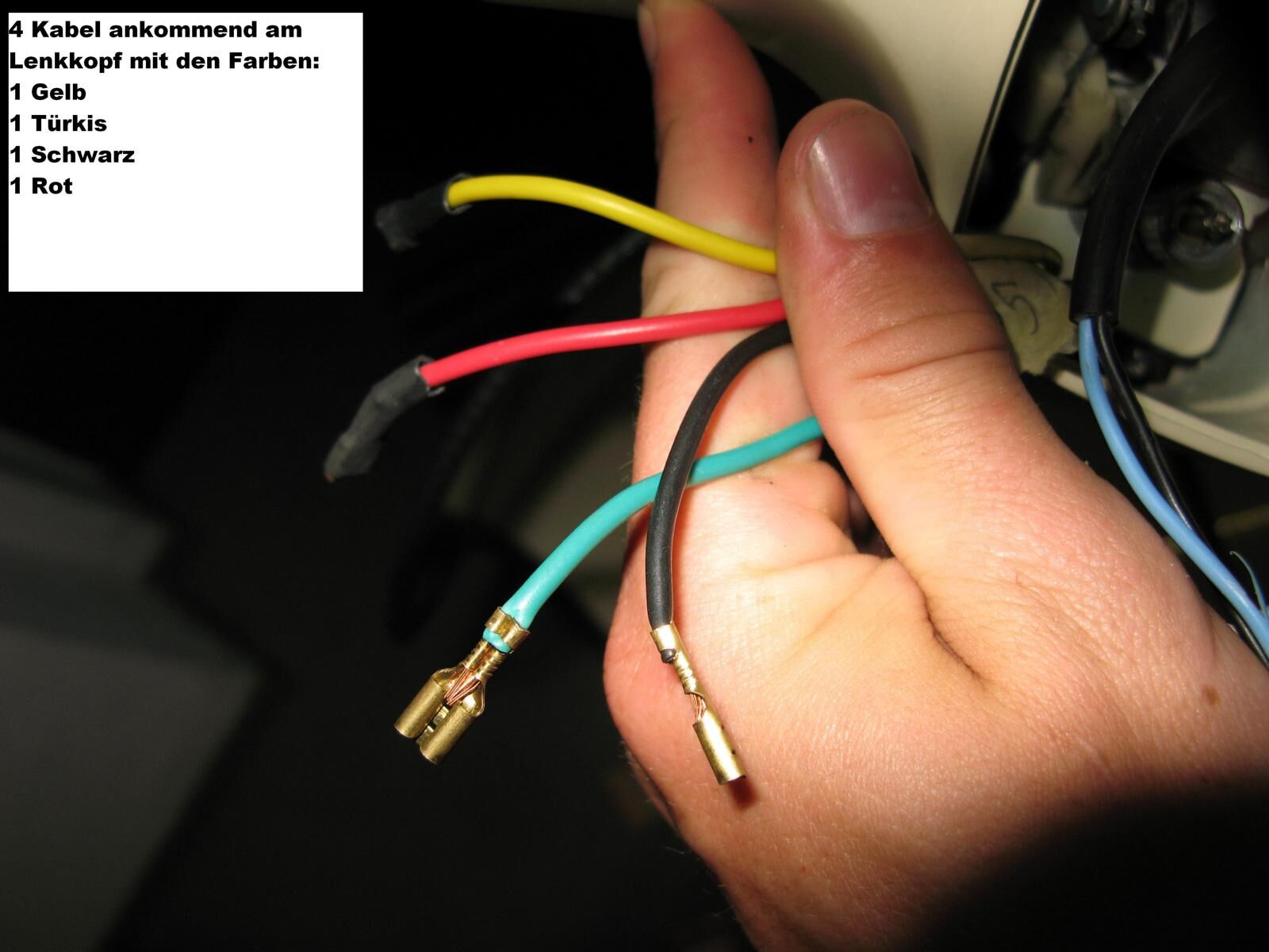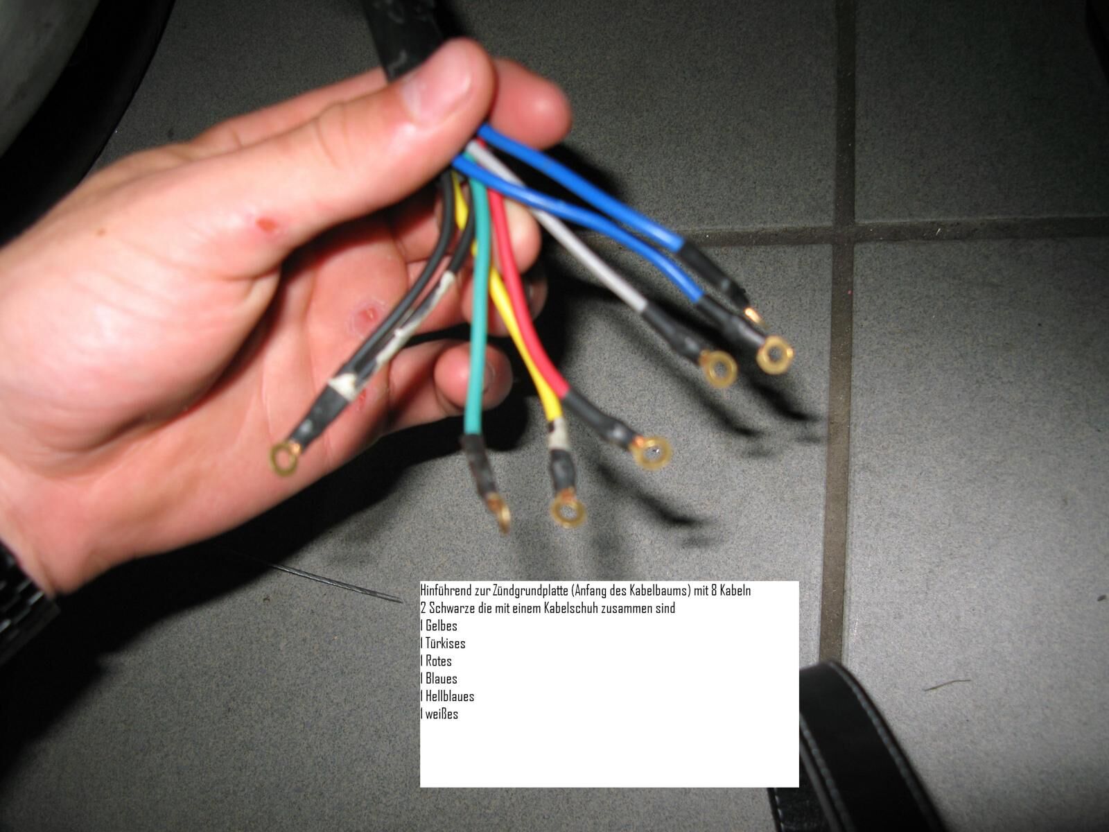 Unten am Kabelkasten hatte ich hellblau an hellblau, gelb an gelb, rot an rot rot (zündspule), Grün an Grün und grau. Oben dann Grün zum Licht, schwarz ans Licht und Masse, sonst alle fleischfarbigen Kabel aneinander.... Ist noch der Originale kabelbaum. Sollte soweit ich weiß alles richtig sein...