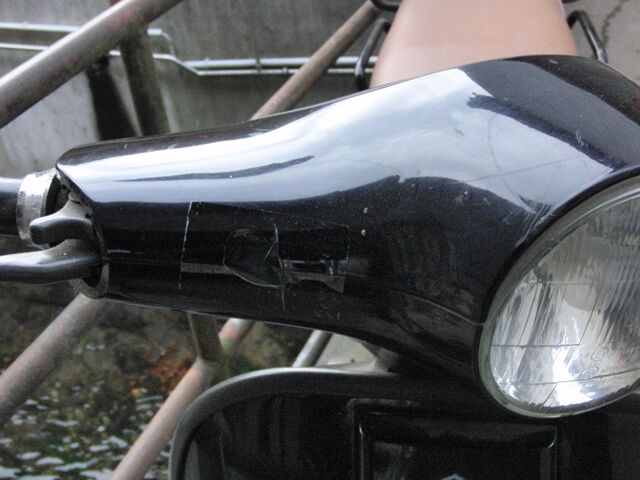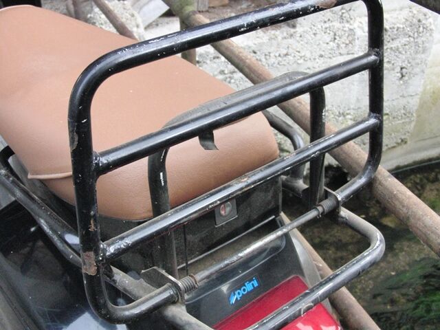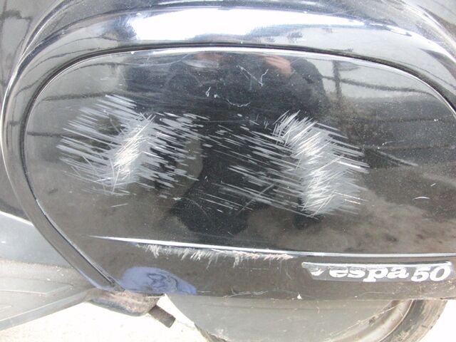 Also hier mal Bilder. WIe gesagt: der Gepäckträger rostet (weil ich da nen Koffer drauf hatte), es gibt ein Loch im Lenkerplastik (da ist der Roller bei Unfall 1 drauf gefallen) und die Seite ist verkratzt udn gebeult.