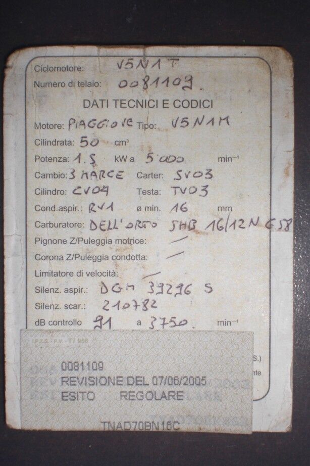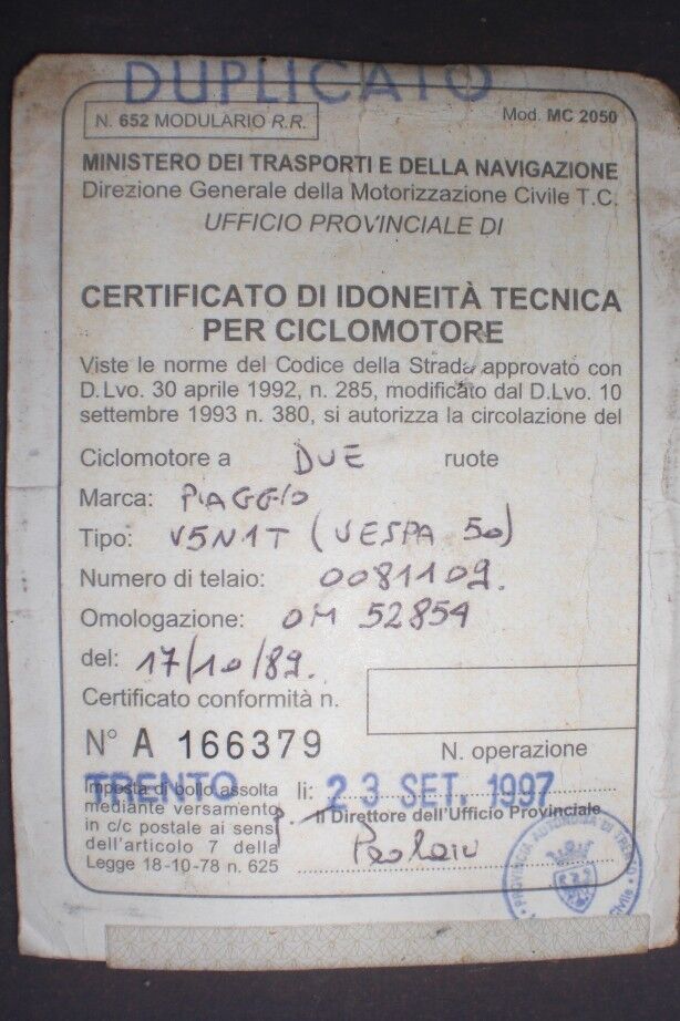 Ich habe in einem Spontankauf eine Vespa 50 (V5N1T) erstanden inklusive italienische Papiere.
