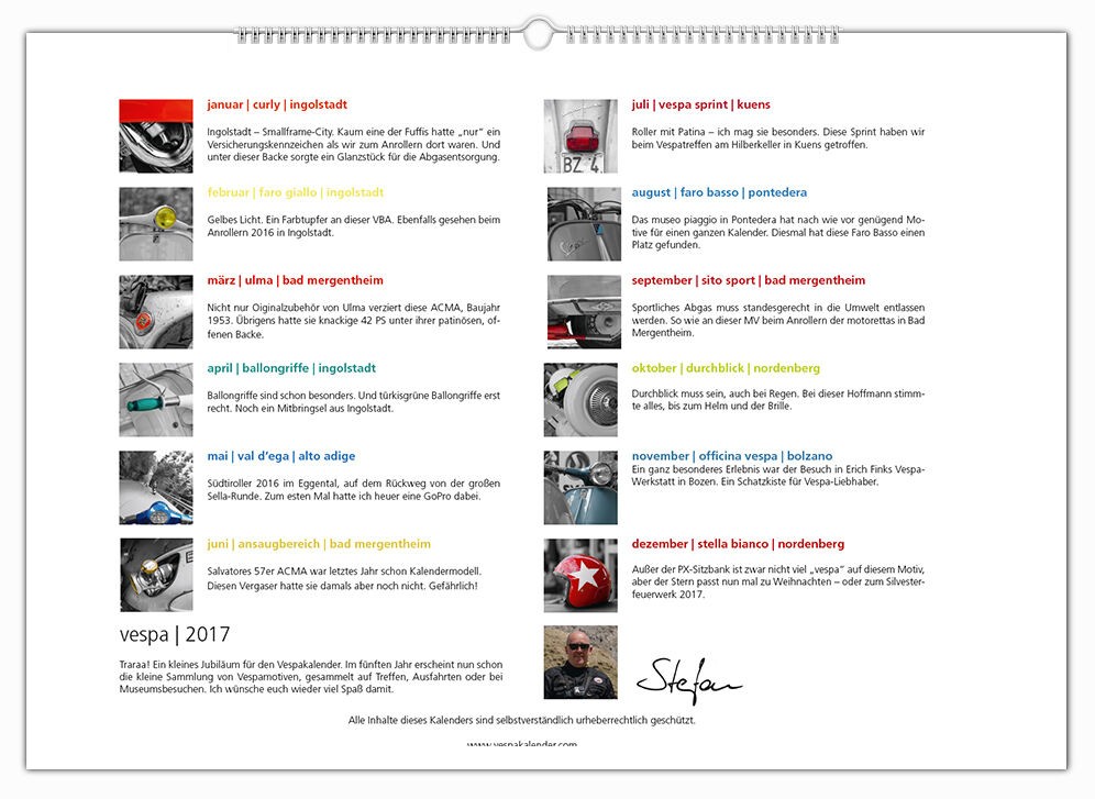 Alle Motive sind bei Treffen oder Ausfahrten enstanden, im Gegensatz zu anderen Technikkalendern ist also kein einziges gestelltes Bild dabei. Diesmal sind ziemlich viele Bilder aus der Schweiz dabei. Ich war über Himmelfahrt im Appenzeller Land zur Vespina 2017. Super Veranstaltung übrigens!