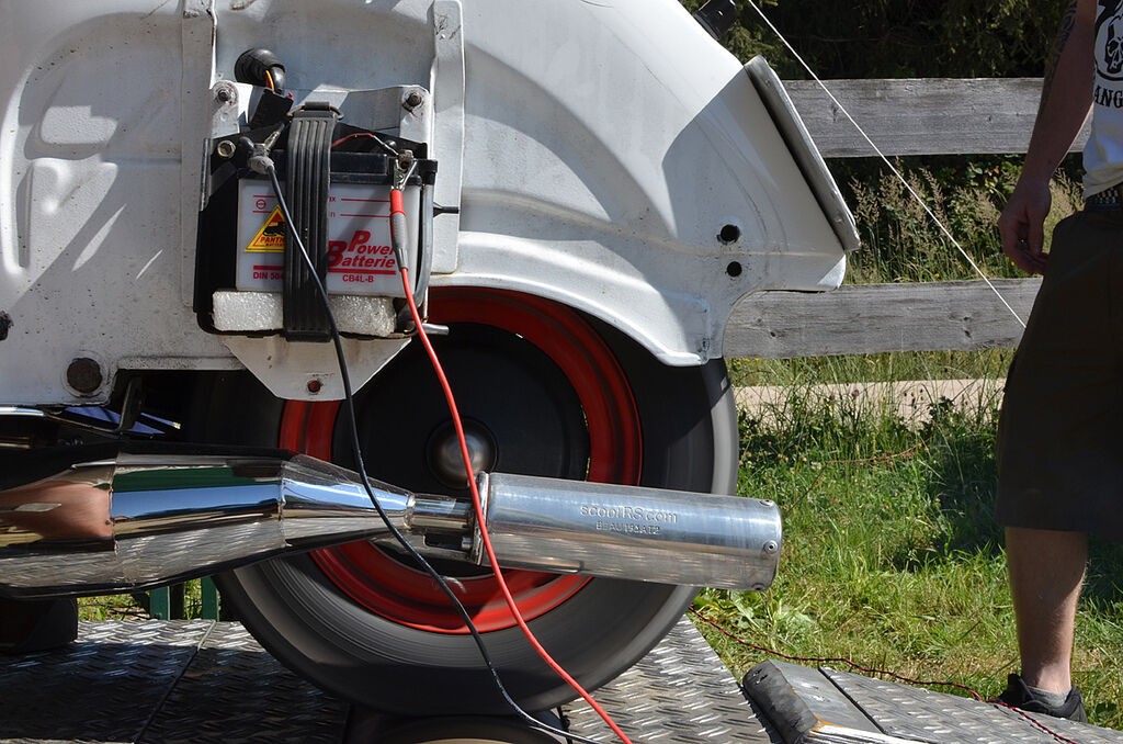 Für lange Touren gut gerüstet ist Robert vom Vespa Club Schweiz. Das Öl wird ihm mit seiner 57er ACMA kaum ausgehen.