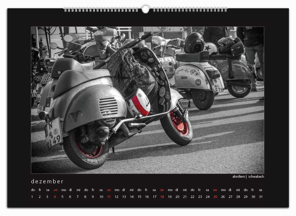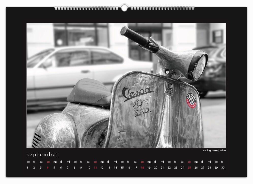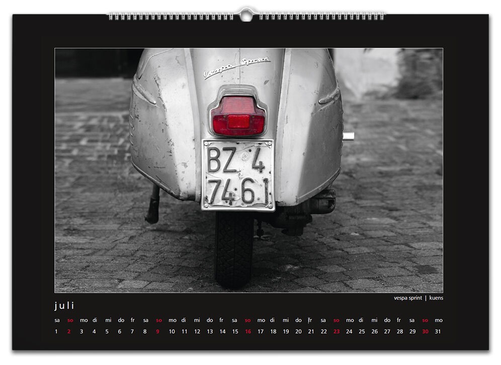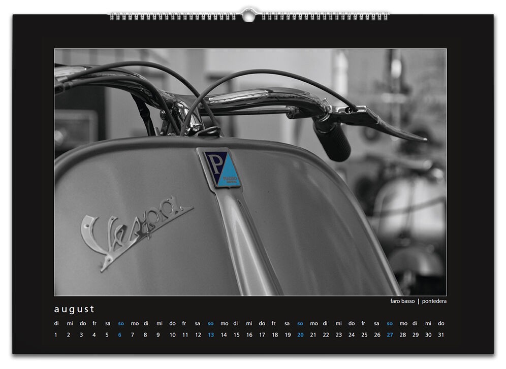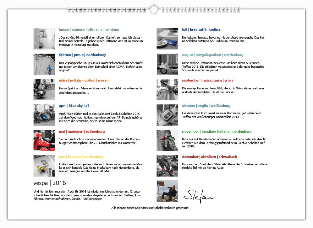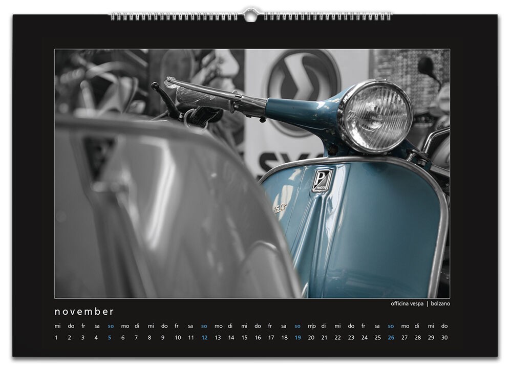 Auch für 2017 gibt es wieder meinen Monatskalender mit 12 Vespamotiven im Format A3. Inzwischen ist es schon der fünfte Kalender und auch heuer wurde er wieder - auch bereits zum fünften Mal - bei SIP in Programm genommen. Die zwölf Motive werde ich nach und nach hier vorstellen, vielleicht erkennt ja der eine oder andere von euch seinen Roller wieder